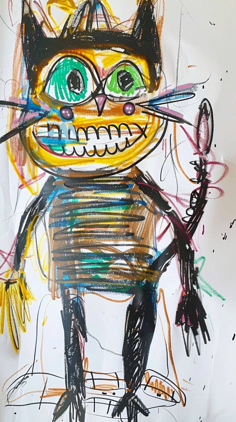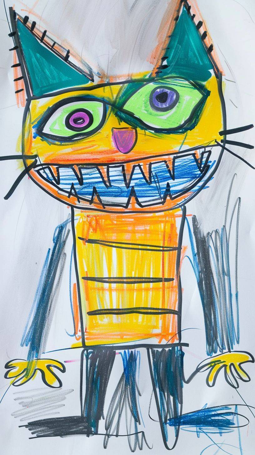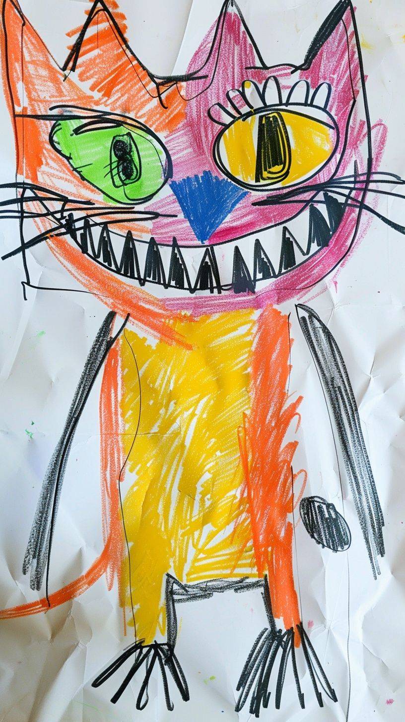 A 4-year-old's basic crayon drawing of a cat alongside a happy monster in a gold costume with black stripes.