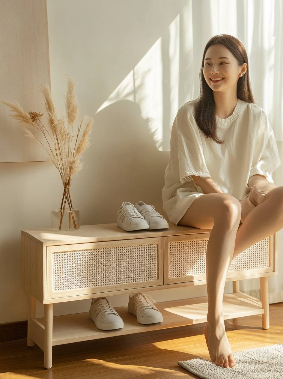 A woman is sitting on the shoe cabinet, with an empty space next to her and shoes placed in front of it. The wooden legged wicker open storage bench has no legs at all, which can be used for sitting or standing up while holding sneakers. It features a Japanese minimalist style and light colored solid wood materials, with natural lighting and soft tones. A person sits casually nearby. She wears casual and smiles as she gently holds one foot over the top of the seating area, in the style of a Japanese minimalist artist. --ar 93:125 --v 6.1