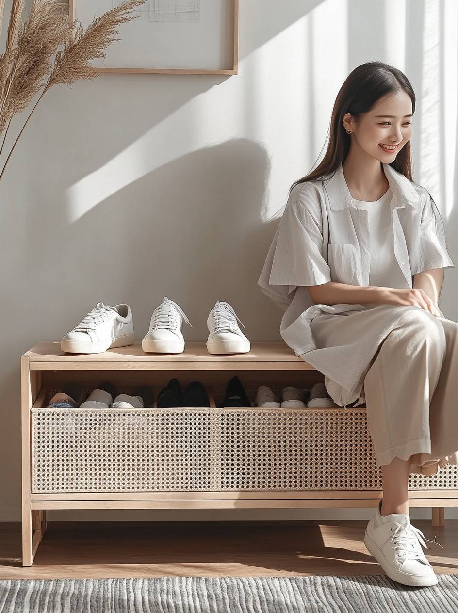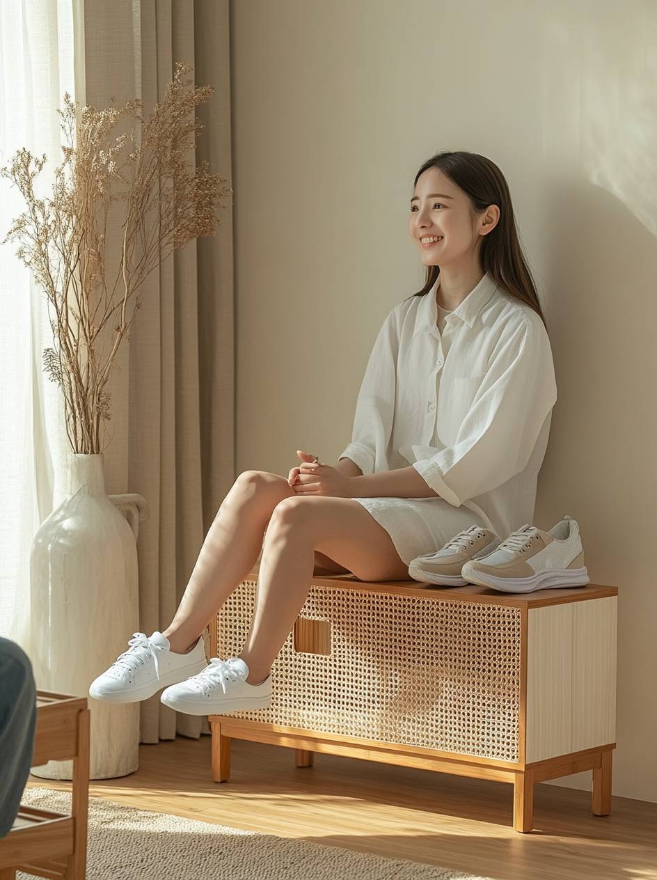 A woman sits on a shoe cabinet, showcasing a relaxed Japanese minimalist vibe.