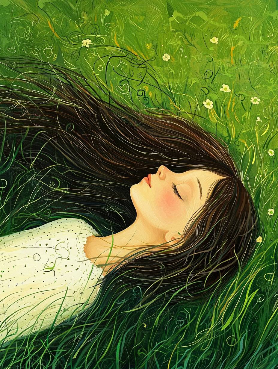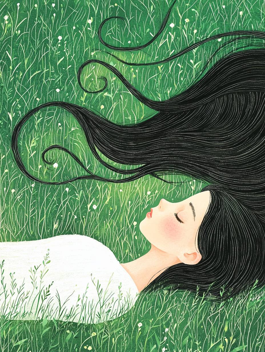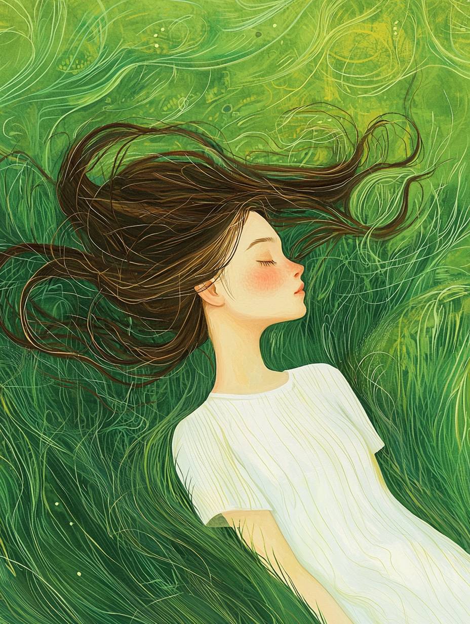 A girl lies on the green grass, her hair flowing in the wind. The artwork is presented as an illustration with soft lines and curves, creating a sense of tranquility. It features a hand-drawn style that emphasizes simplicity and elegance. by Wona Lifsches. --ar 3:4 --quality 2 --v 6.1