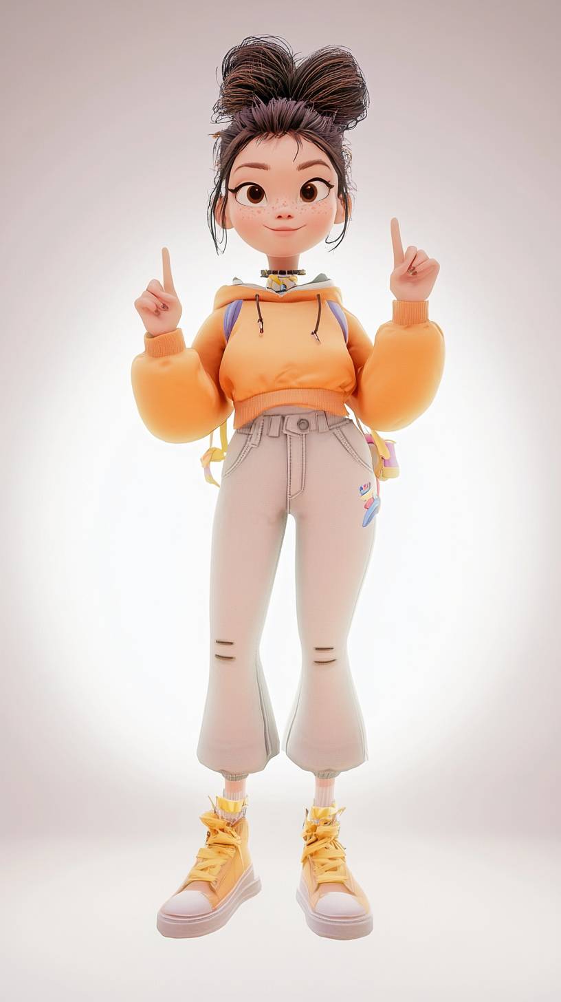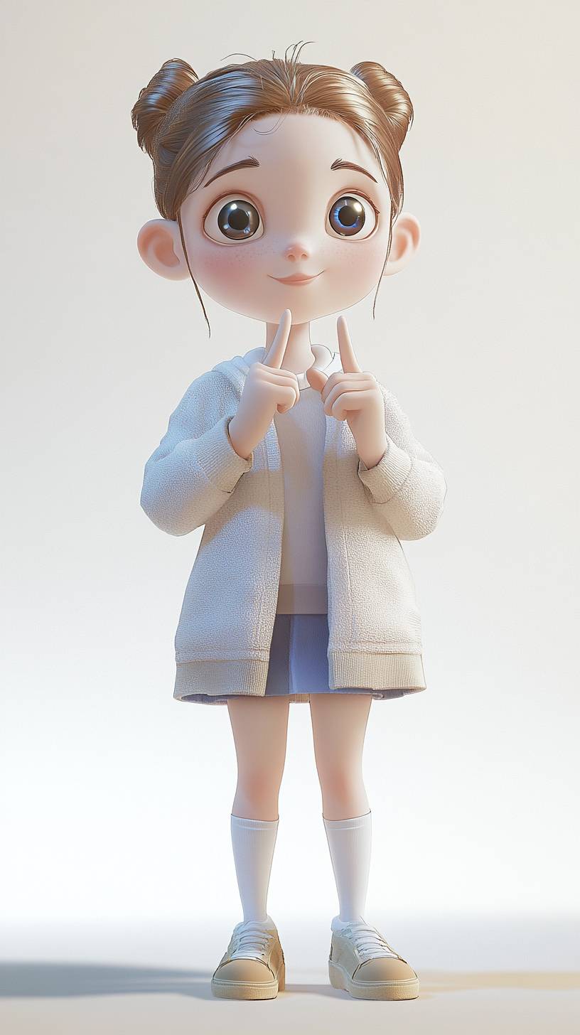 A She snaps her fingers , fullbody , light background, white light, in the style of Unreal Engine, playful cartoons, detailed character design, Big head Toydoll proportions , very detailed high resolution --no cap, crop, black border, Blank, cropped, blurred, low image quality, low angle analysis ,anatomical error --ar 9:16 --style raw --stylize 50 --v 6.1