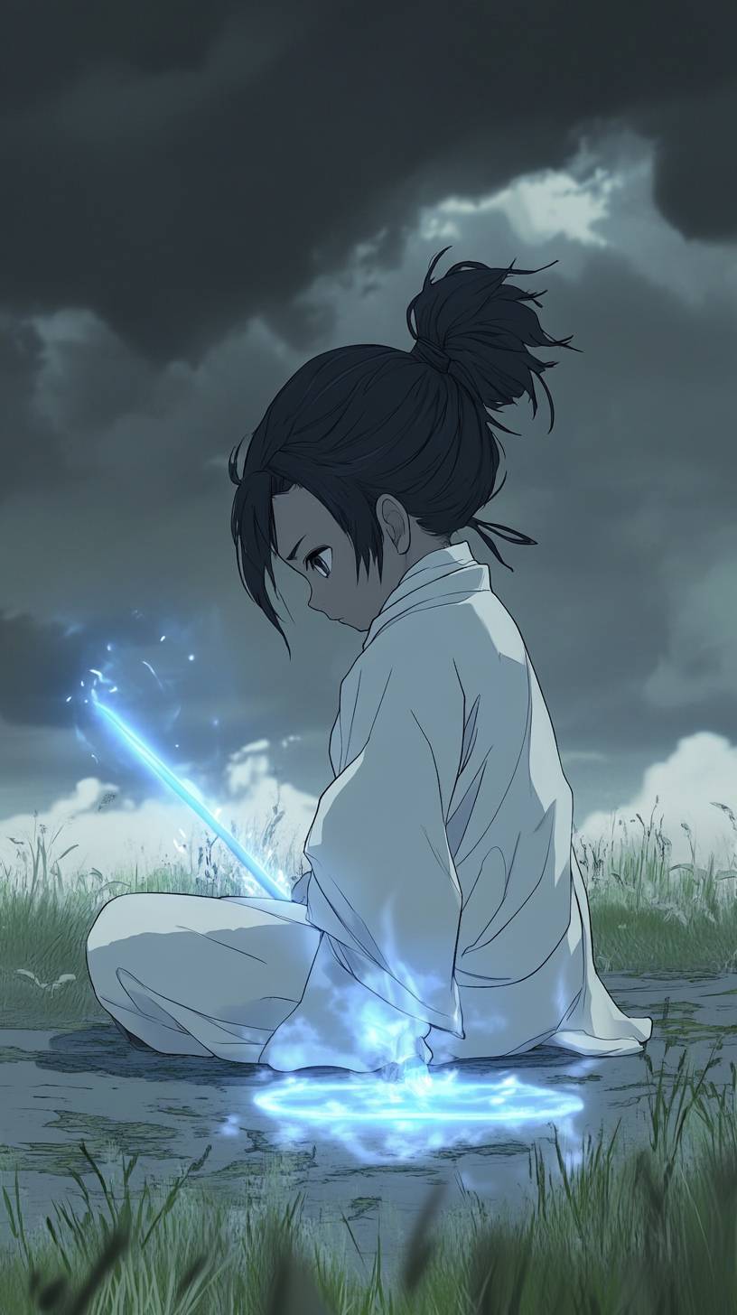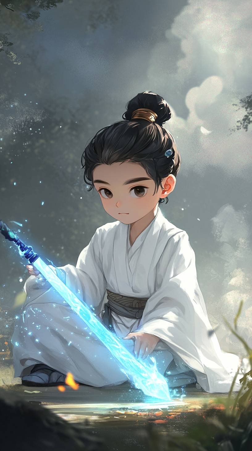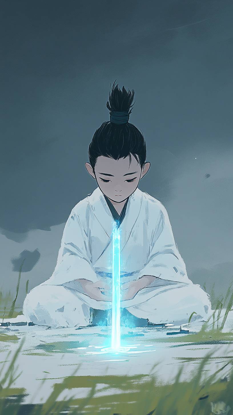An animation-style character, a young boy with black hair tied in a ponytail and wearing a white robe sitting on the ground while a floating blue light sword flies around him, with a background of a green field and gray sky in the style of a Chinese ancient cartoon style drawing. --ar 9:16 --v 6.1