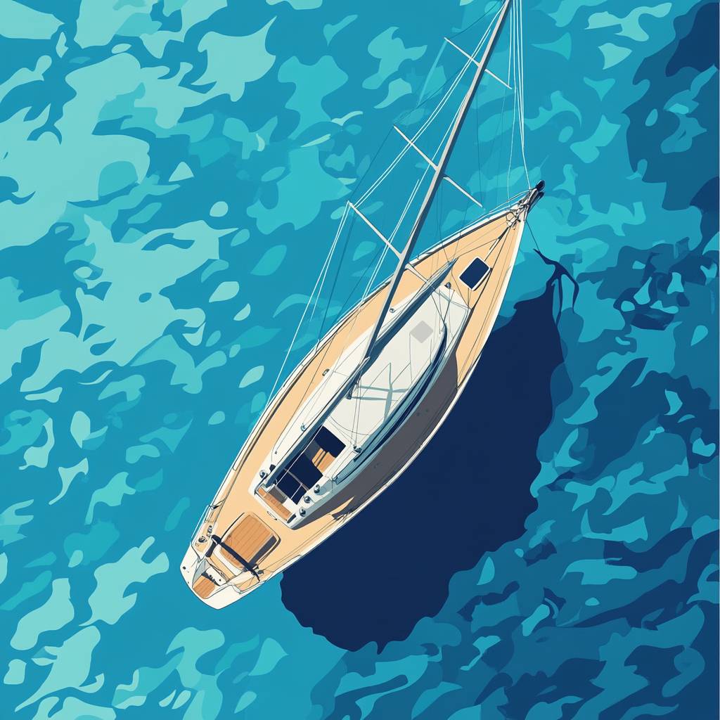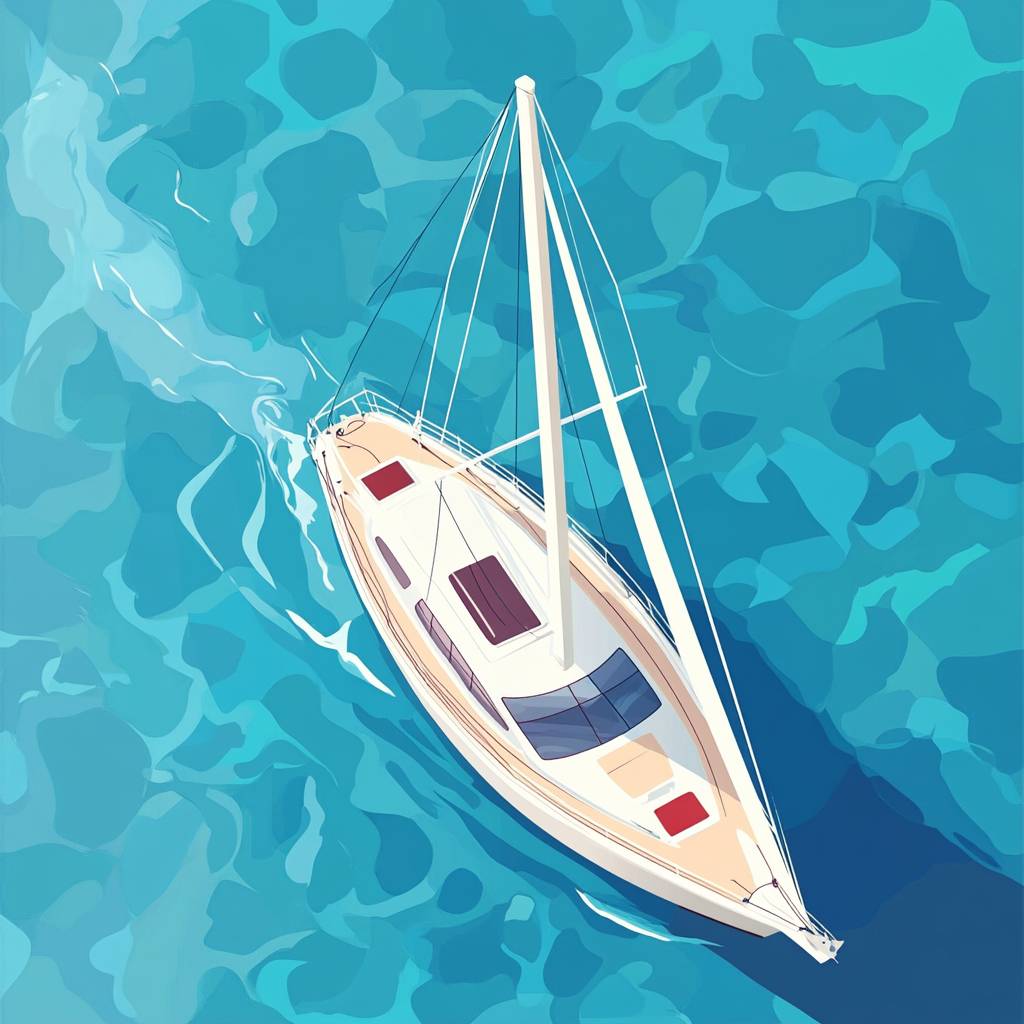 vector flat illustration of a Sailboat, aerial view , flat blue sea background, 4 colors --v 6.1