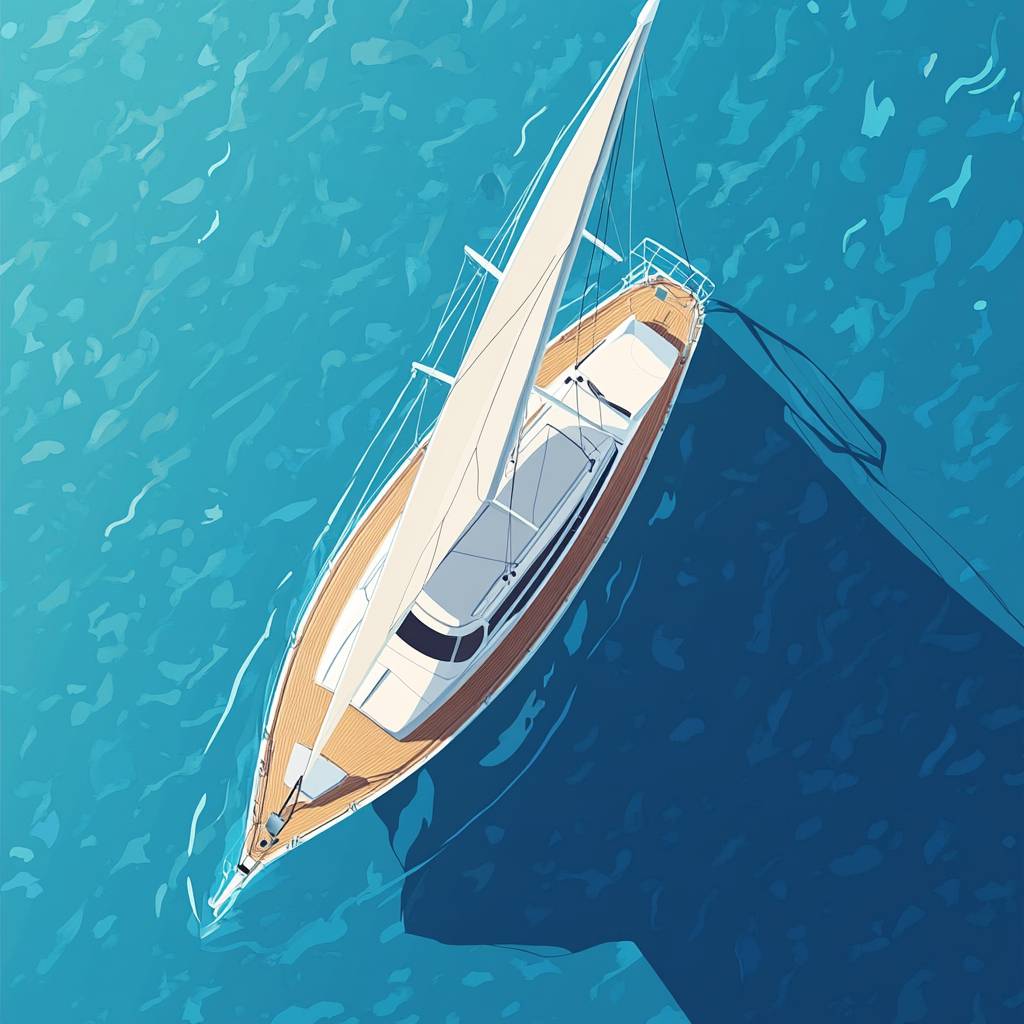 Vector flat illustration of a sailboat, aerial view, flat blue sea background, 4 colors