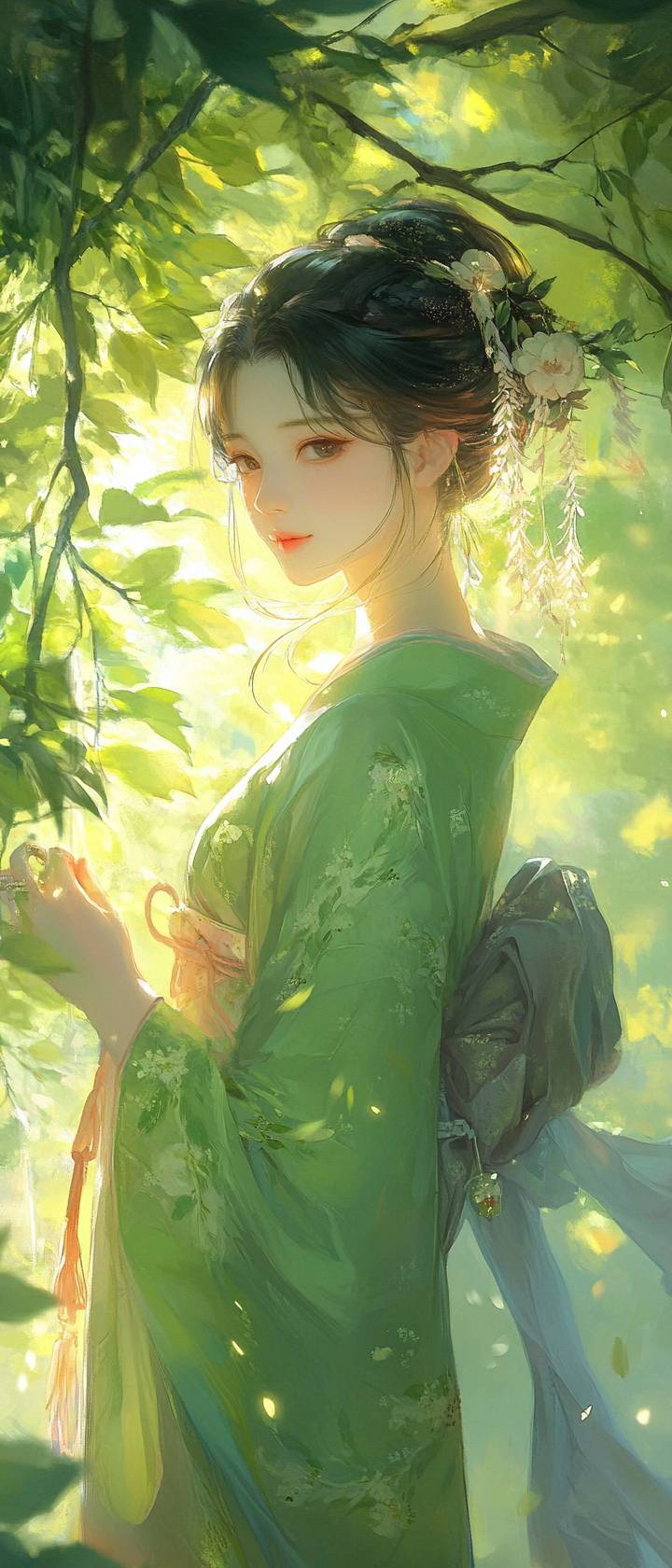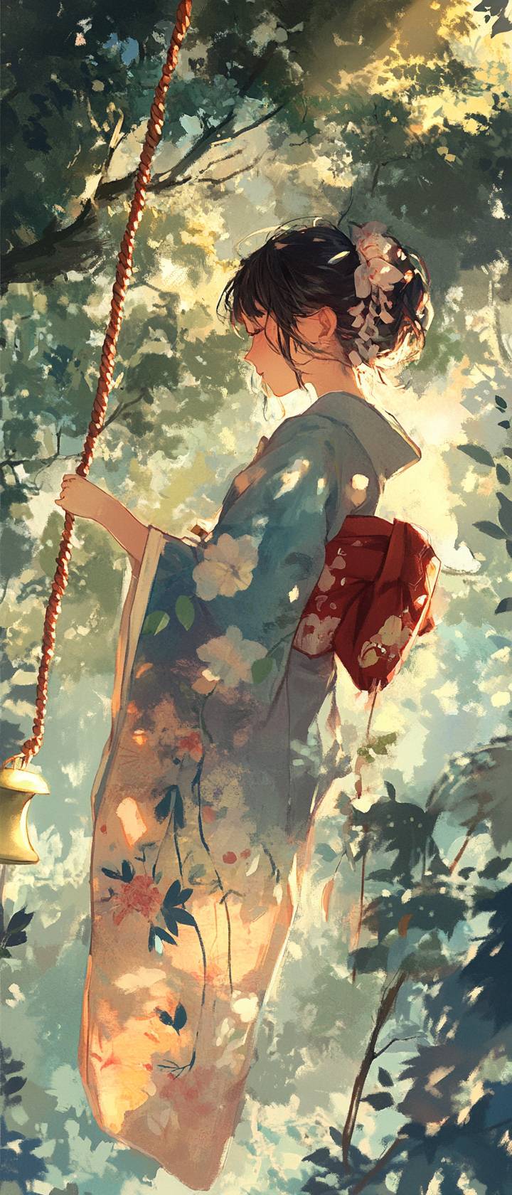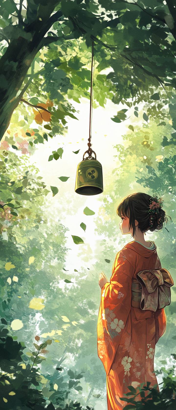 A sylph, yukata, a wind bell, early morning in summer, delightful, good fortune, agreeable, pleasant, wind effects, sunlight filtering through the leaves, quiet moment in nature.