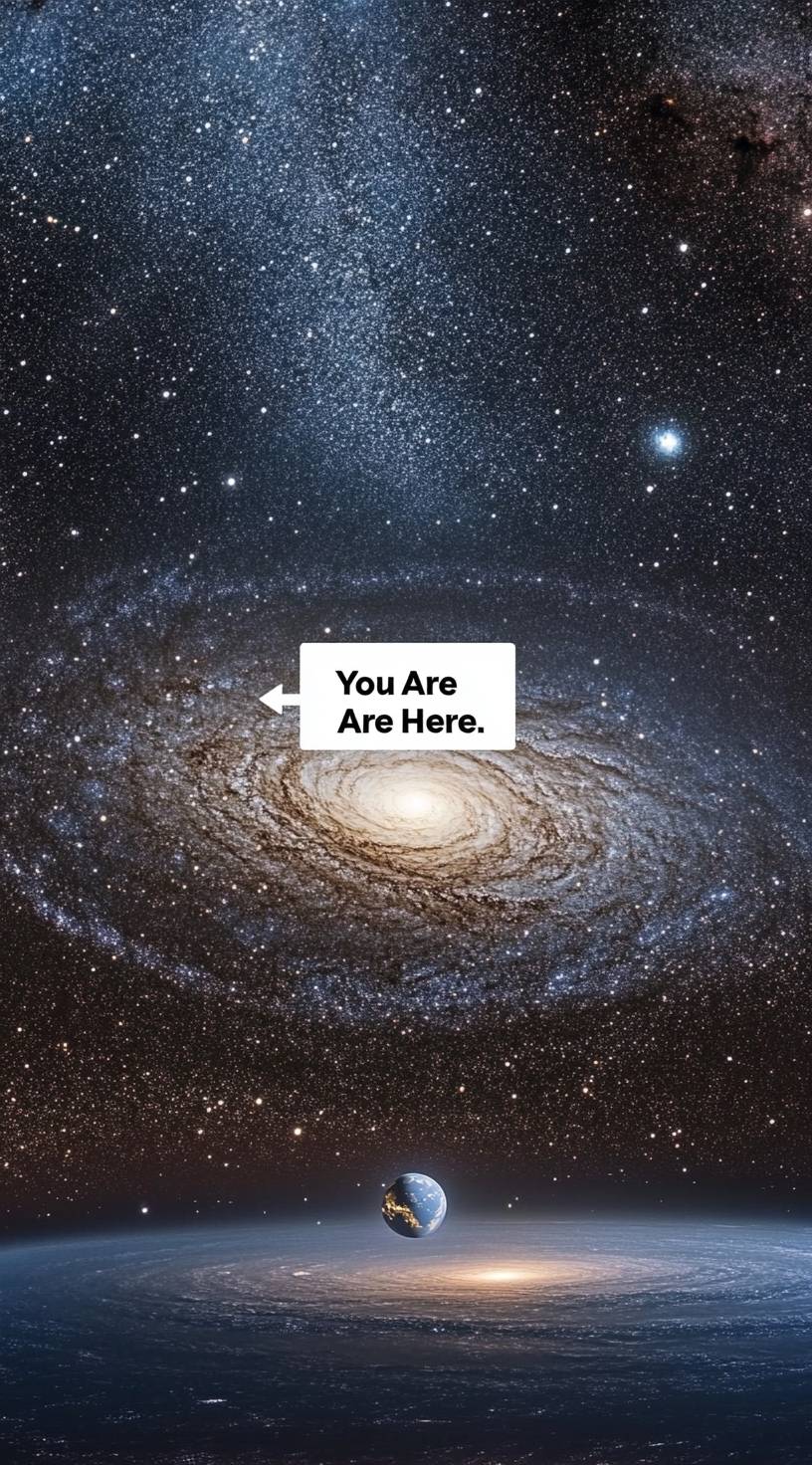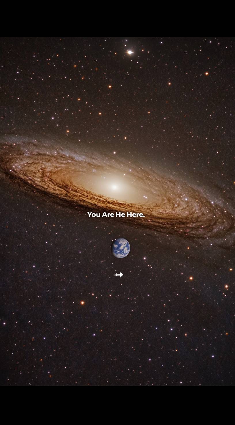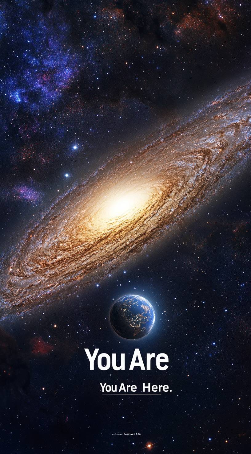 The Andromeda Galaxy, a real photograph, offers a breathtaking view of the Milky Way galaxy in space, with glowing stars and nebulae, sharp focus on details, professional-quality photography, high resolution, HDR (high dynamic range), high-definition quality, stunning, breathtaking, award-winning photography, featured on the cover of National Geographic magazine, a trending realistic galaxy background with the Andromeda spiral galaxy. The universe is full of beautiful galaxies and a bright, starry sky. Highly detailed. And Place an image of a globe at the center of a galaxy. The globe should be small and fit perfectly in the center. Add an arrow pointing to the globe with the caption "You Are Here." Full hd 8k --ar 71:128 --v 6.1