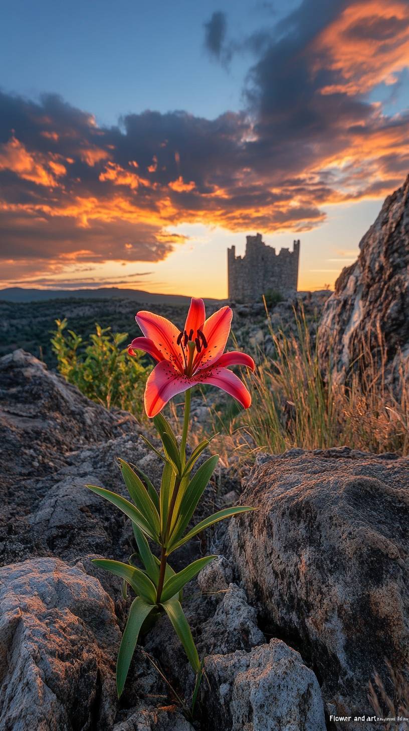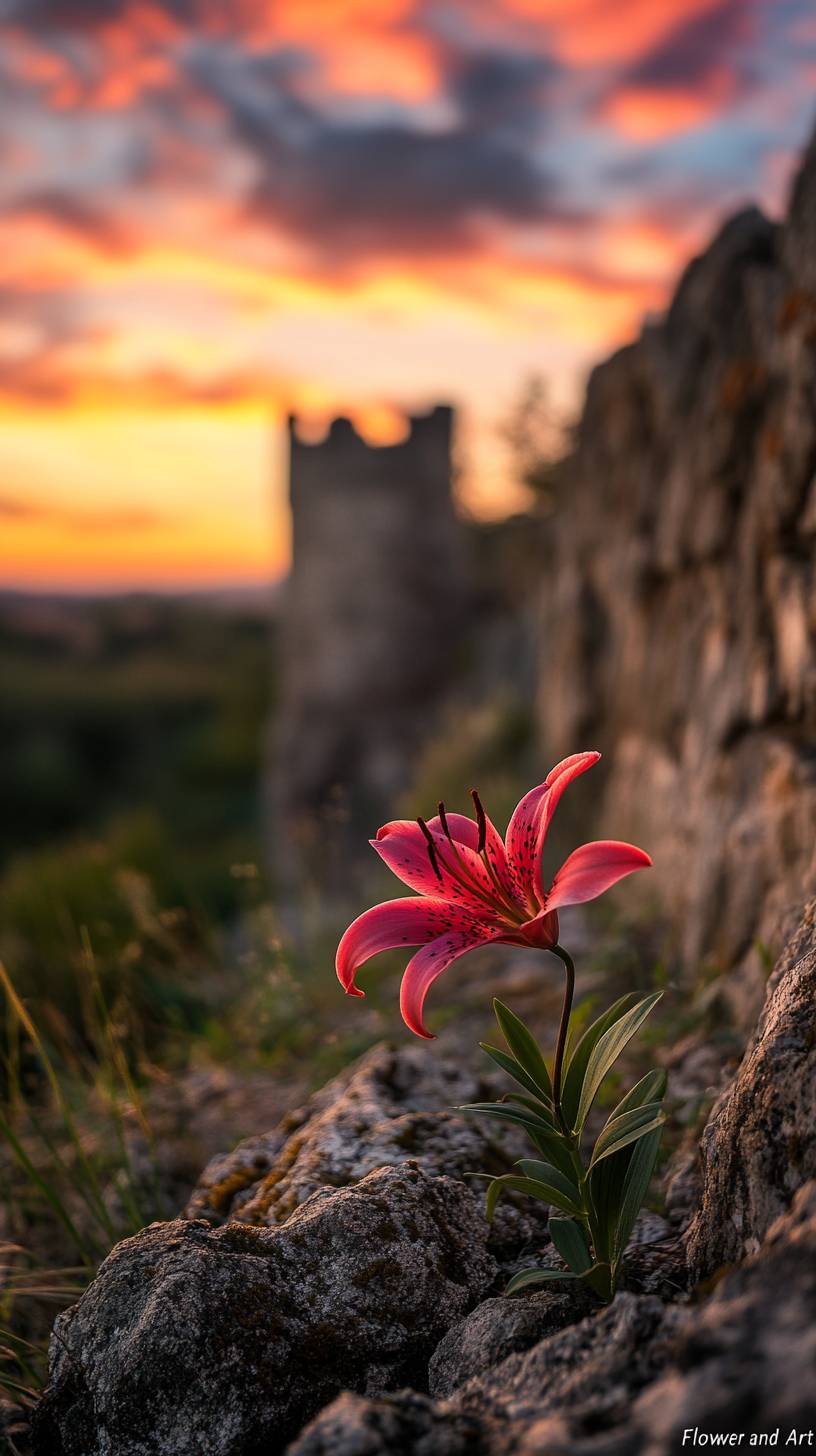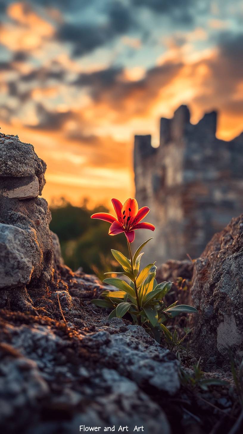 A small red lily blooming on the ruins of an ancient castle, a sunset sky with warm colors, professional photography, award-winning work in the style of "Flower and Art", Nikon D850. --ar 9:16 --v 6.1