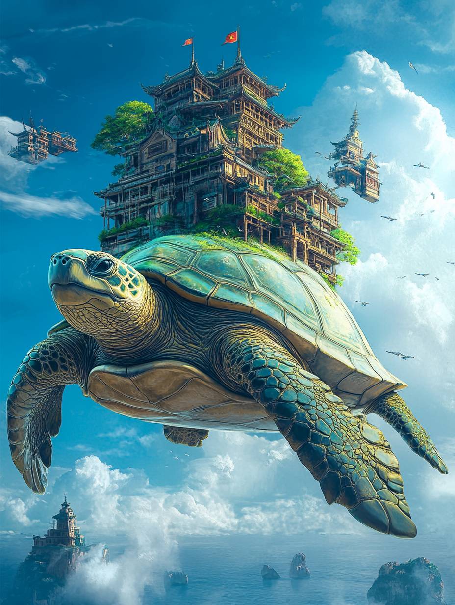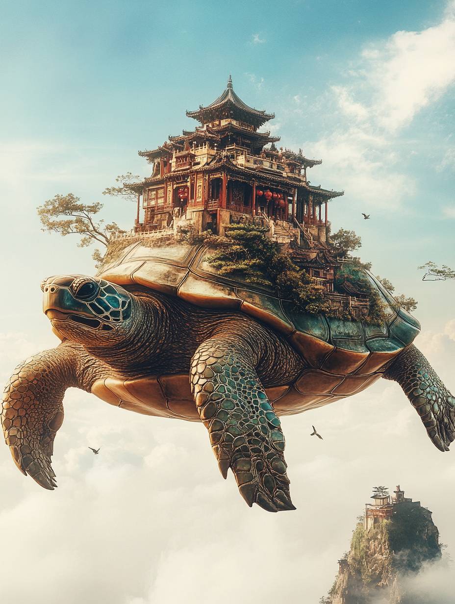 A giant turtle, holding a Chinese classical palace on its back, is flying and suspended in the sky, creative, solemn, aura and bright --ar 3:4 --style raw --v 6.1