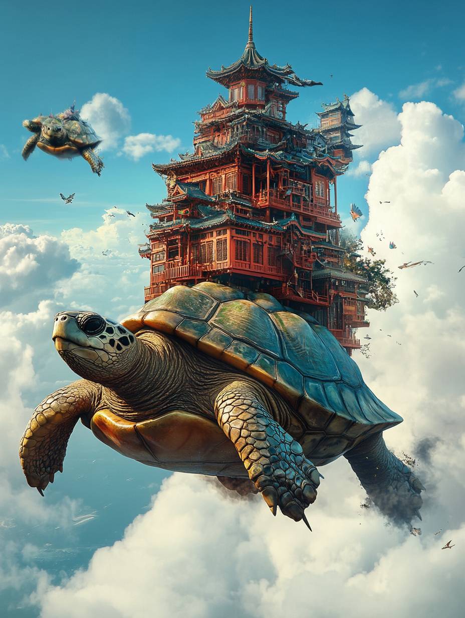 A giant turtle is flying in the sky with a Chinese classical palace on its back.