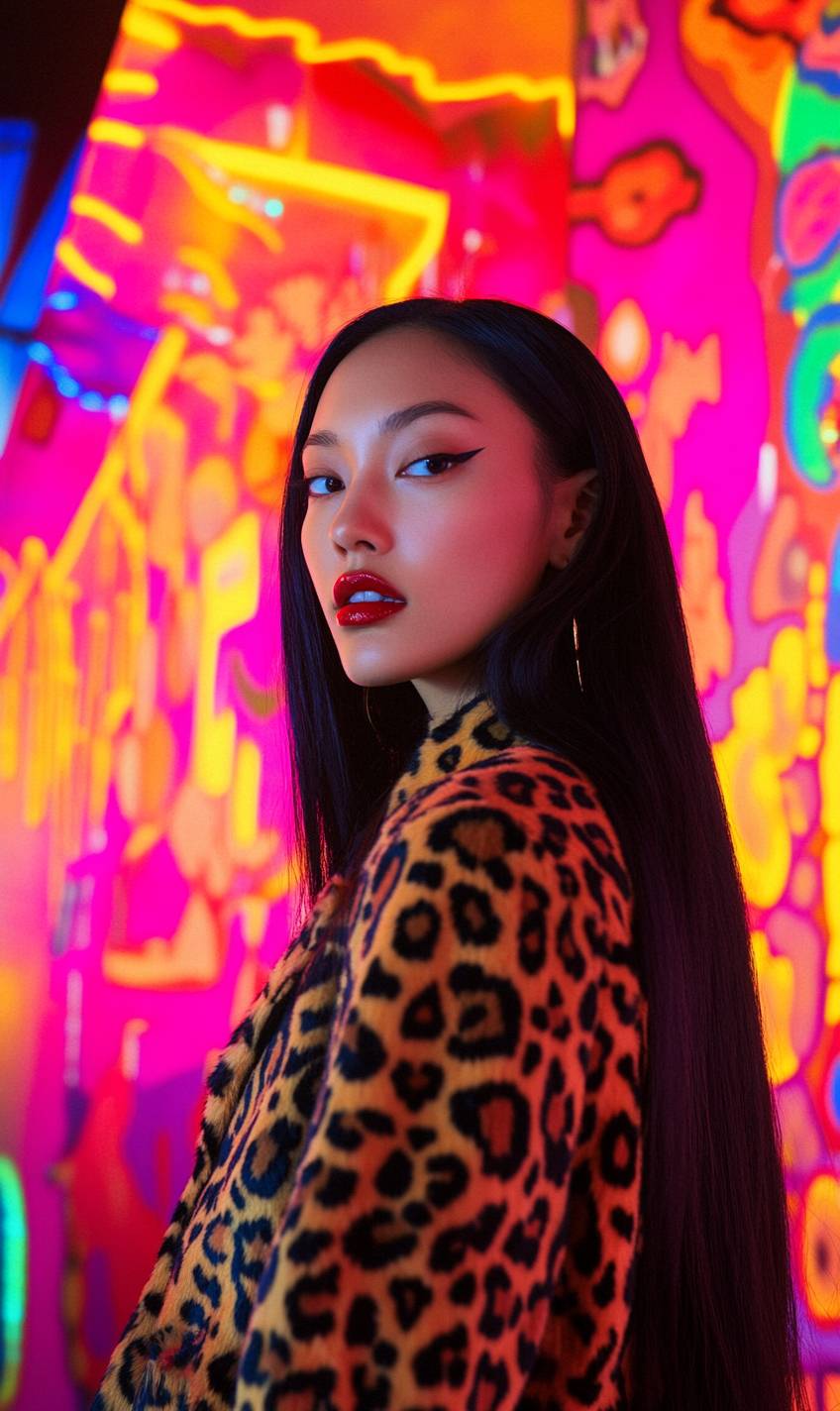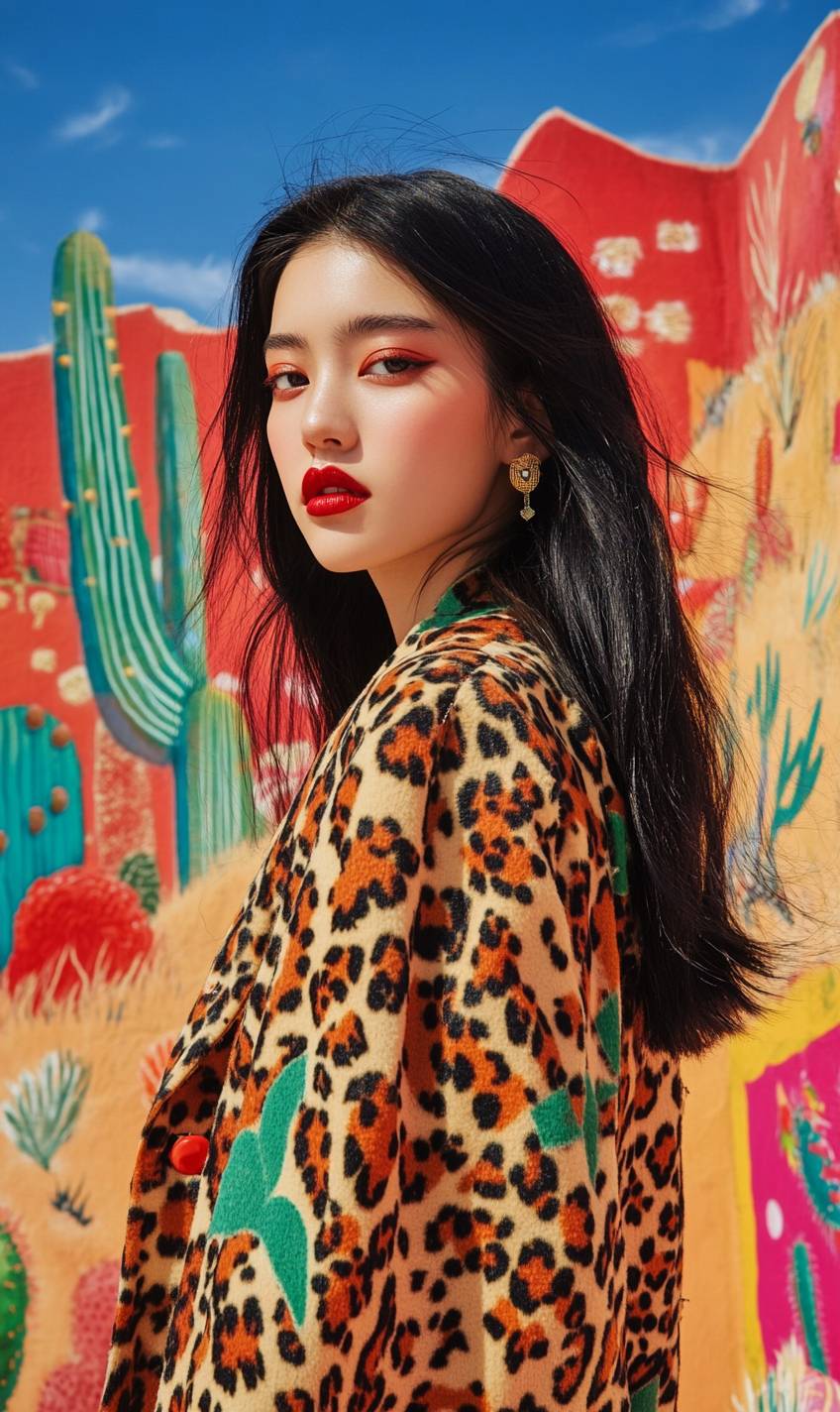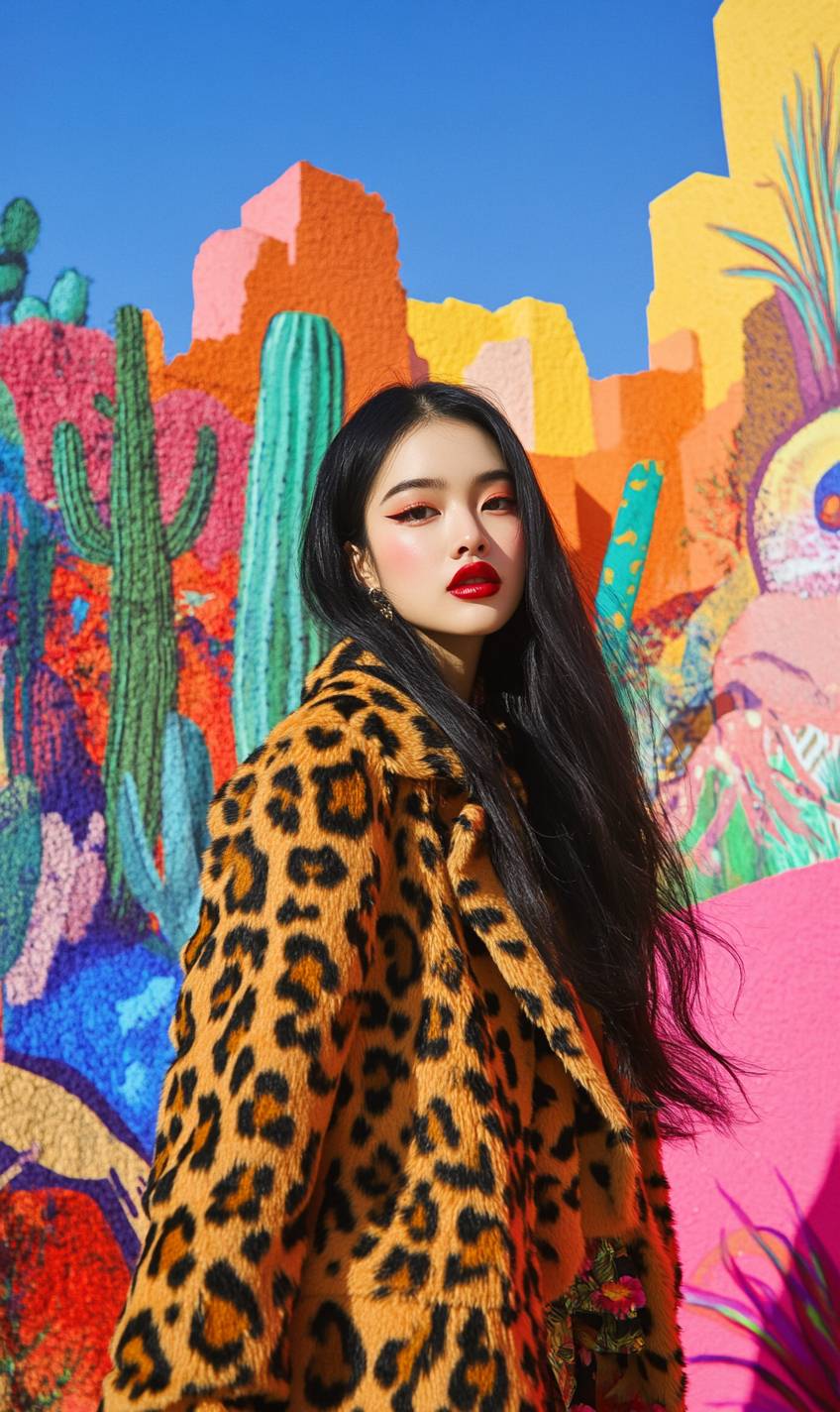 High-resolution editorial fashion photography, with a vibrant, artistic aesthetic, featuring a young Asian female model with long, sleek black hair, wearing a striking leopard-print coat. The outfit showcases bold animal prints that contrast with the colorful background. The scene is set against a vivid and surreal mural of a desert landscape, filled with brightly colored cacti, trees, and abstract shapes, all in neon and pastel hues. Bright, saturated lighting creates a lively and playful mood, highlighting the model’s bold red lipstick and the vivid colors around her. The model is standing slightly to the side, gazing confidently at the camera, adding to the dynamic composition. Shot on Kodak Portra 400, with a vibrant neon, bold primary colors, and earthy animal print palette.