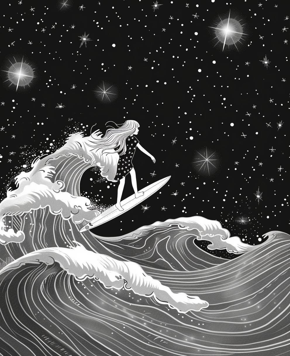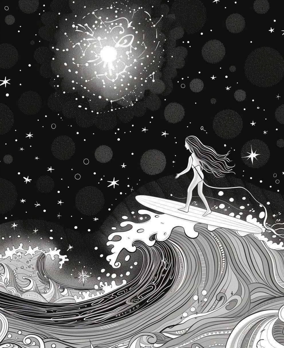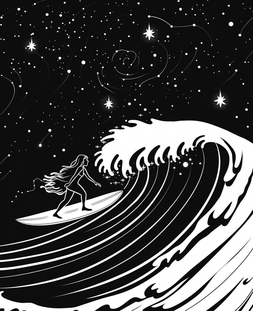 illustrate a Girl on a surfboard surfing some surreal waves, stars shining bright in the background, cartoon style, thick lines, low detail, no shading, no colours --ar 9:11