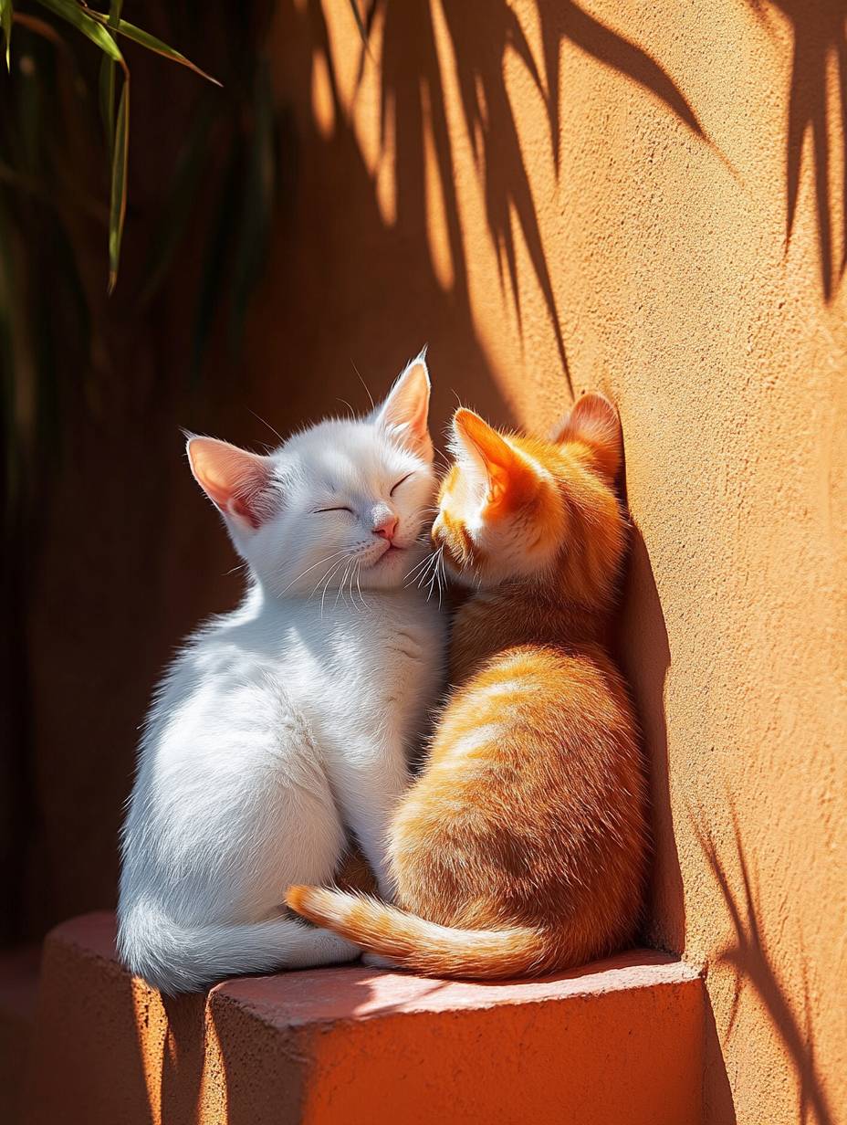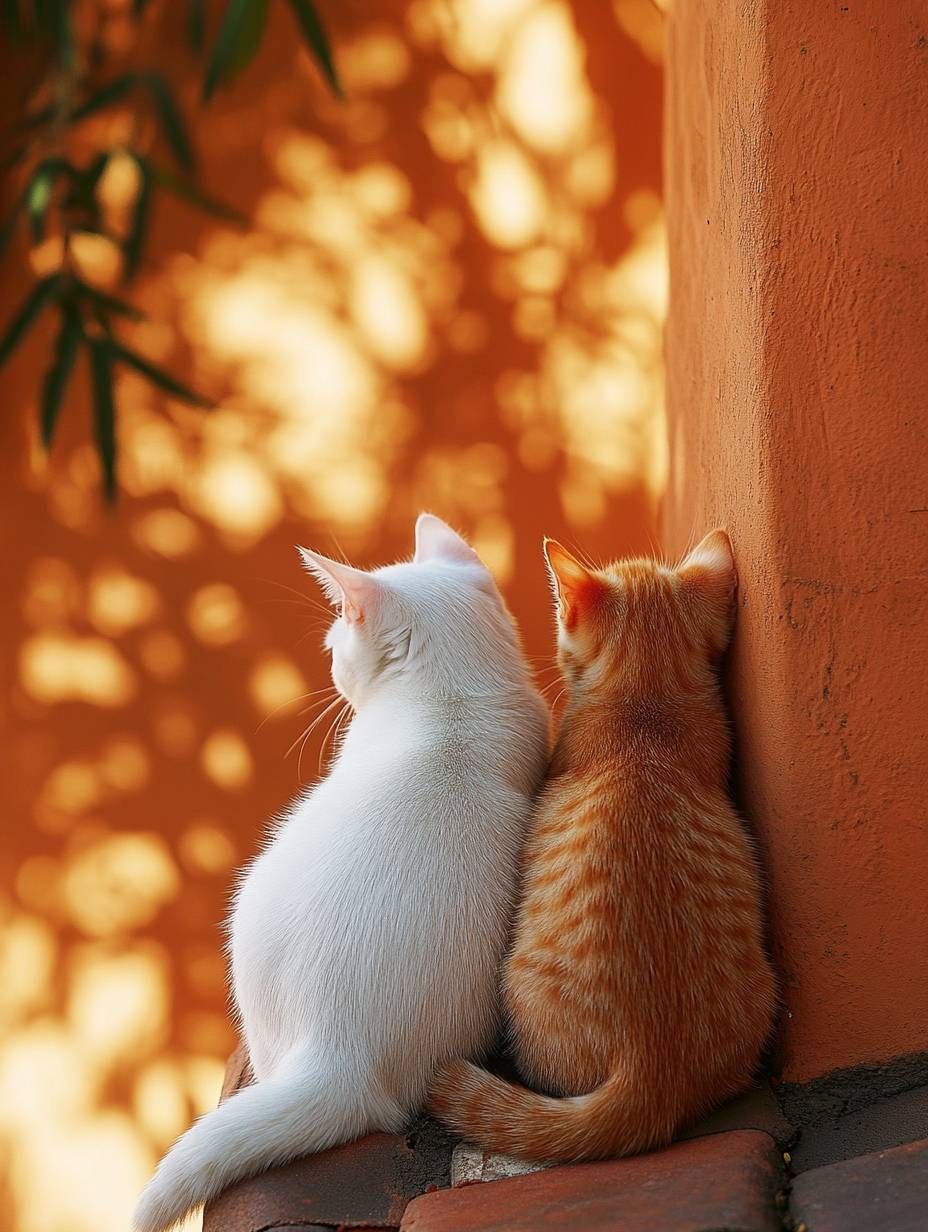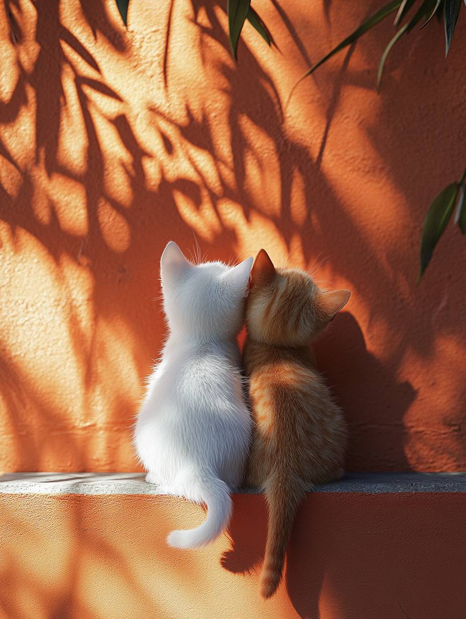 A white cat and an orange kitten, sitting on the edge of the roof in front of an orange wall with bamboo shadows, snuggling together, playing and nuzzling each other's necks. The photo is taken from behind them, with a close-up shot. The background color is a bright orange, creating a strong contrast between warm and cool tones. It creates a beautiful and peaceful atmosphere. The photo was captured using a Canon EOS R5 camera, with ultra-high resolution and ultra-realistic details. --ar 3:4 --stylize 250 --v 6.1