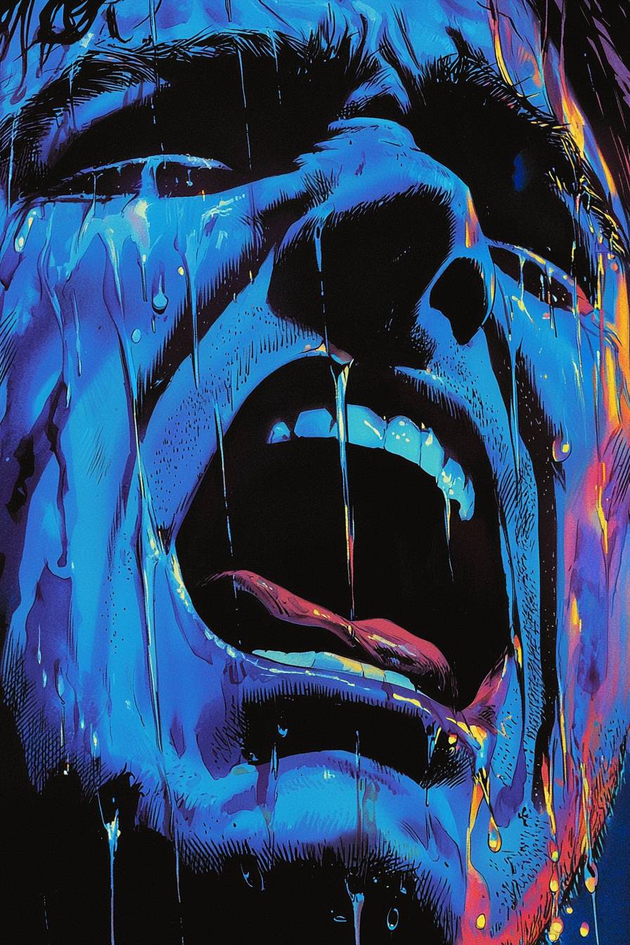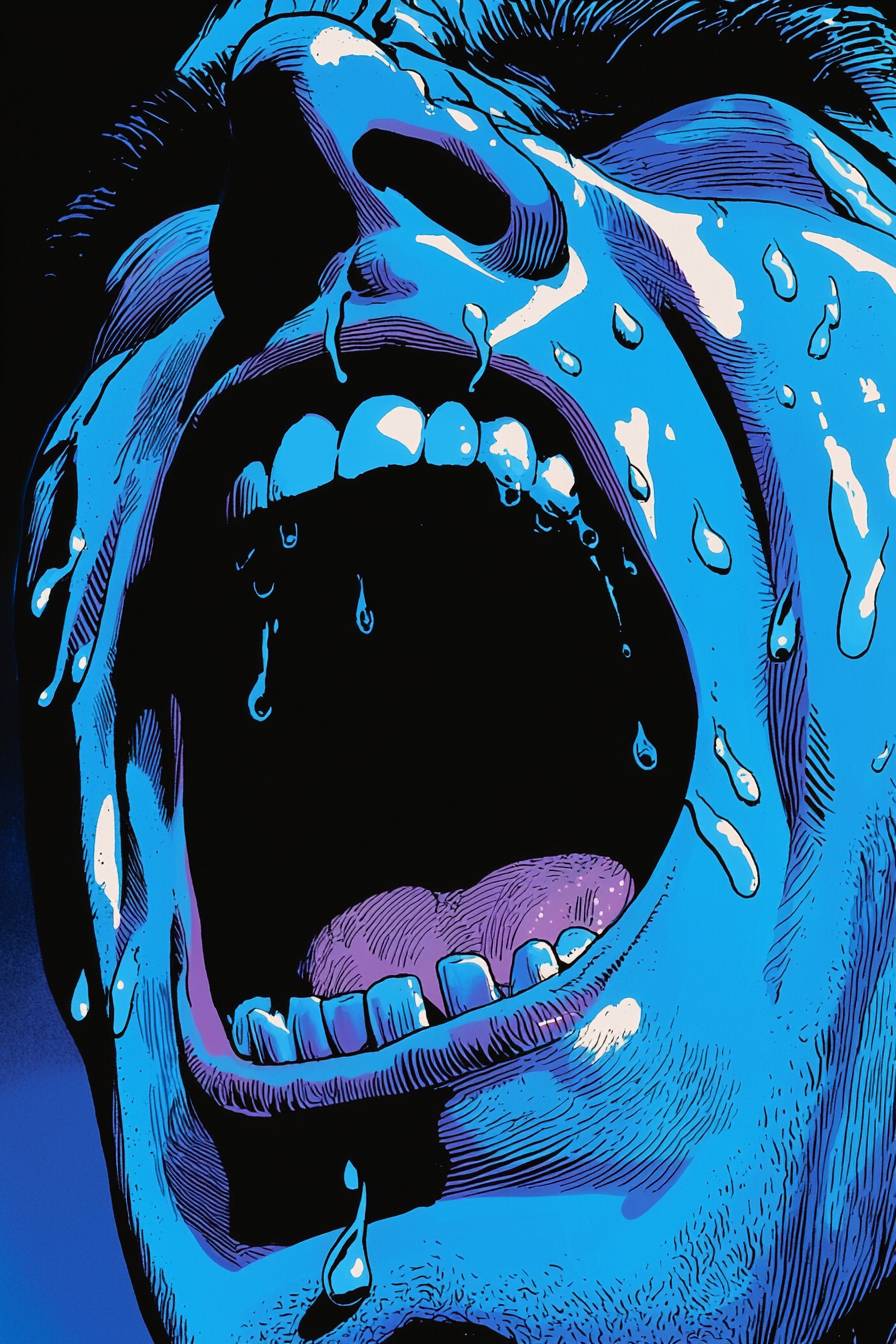 Extreme close-up of a man crying desperately, tears all over his face, mouth open in a desperate facial expression, in the style of waterbrush colors a graphic novel.