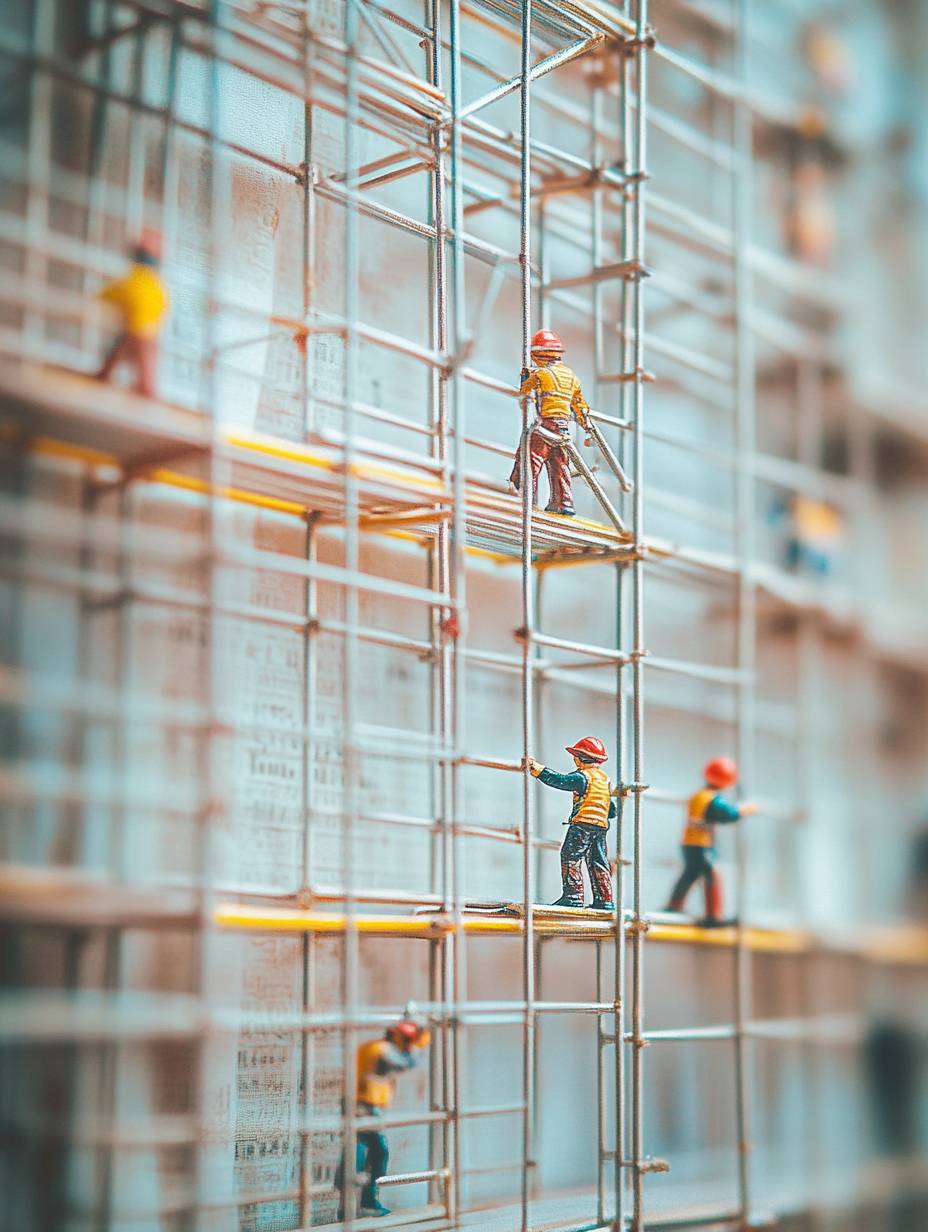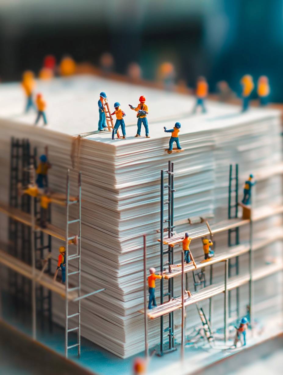 Several miniature figures are building a huge book on scaffolding,side view, long distance,in a minimalist style,marco photo, tilt shift --ar 3:4 --v 6.1