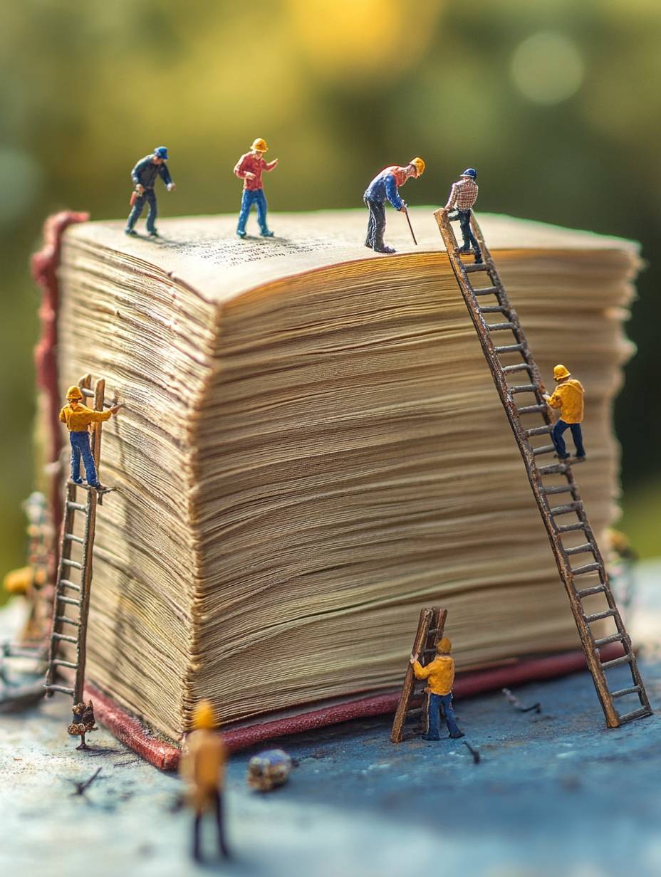 Several miniature figures are building a huge book on scaffolding, side view, long distance, in a minimalist style, macro photo, tilt shift.