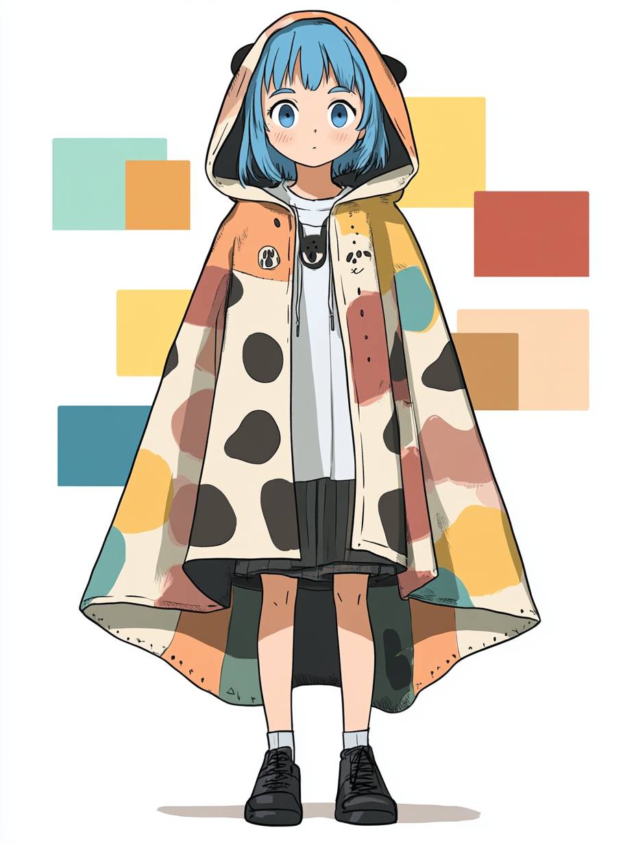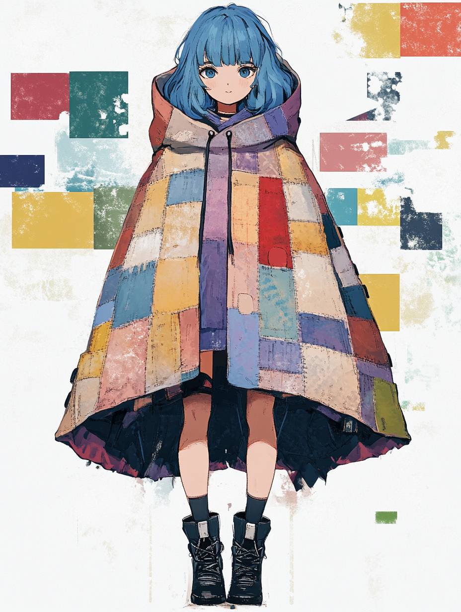 A cute girl with blue hair and bangs, wearing an oversized hooded cape with dog-eared details, made of patchwork cloth in pastel colors. She wears black shoes, set against a simple background with colorful blocks, in the style of Hayao Miyazaki, in an anime style.