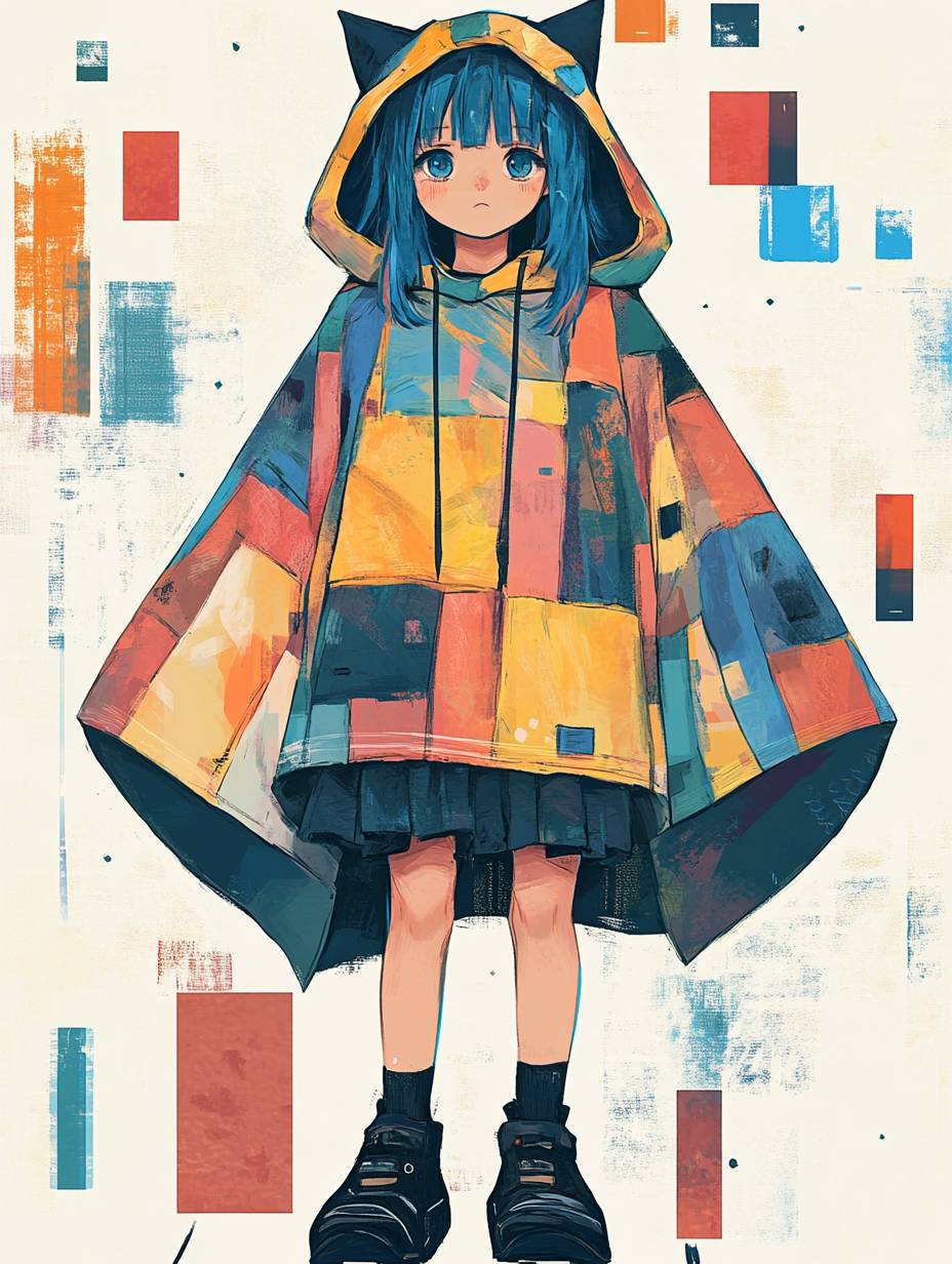 A cute girl with blue hair and bangs, wearing an oversized hooded cape with dog-eared details, made of patchwork cloth in pastel colors. She wears black shoes, set against a simple background with colorful blocks, in the style of Hayao Miyazaki, in an anime style. --ar 3:4
