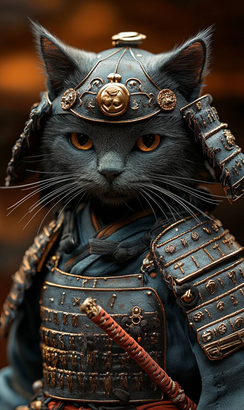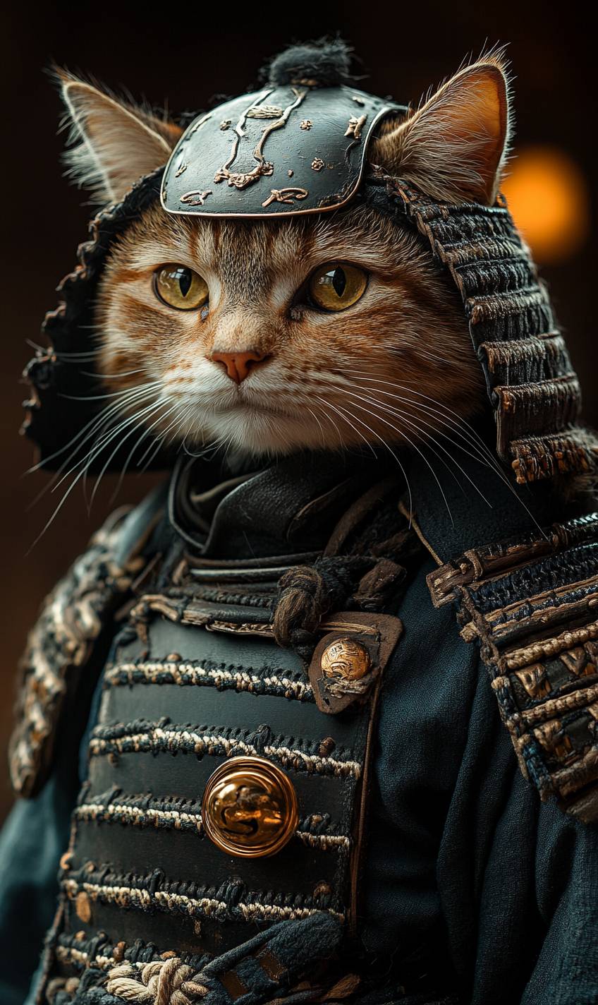 Cute Maine Coon cat wearing samurai armor