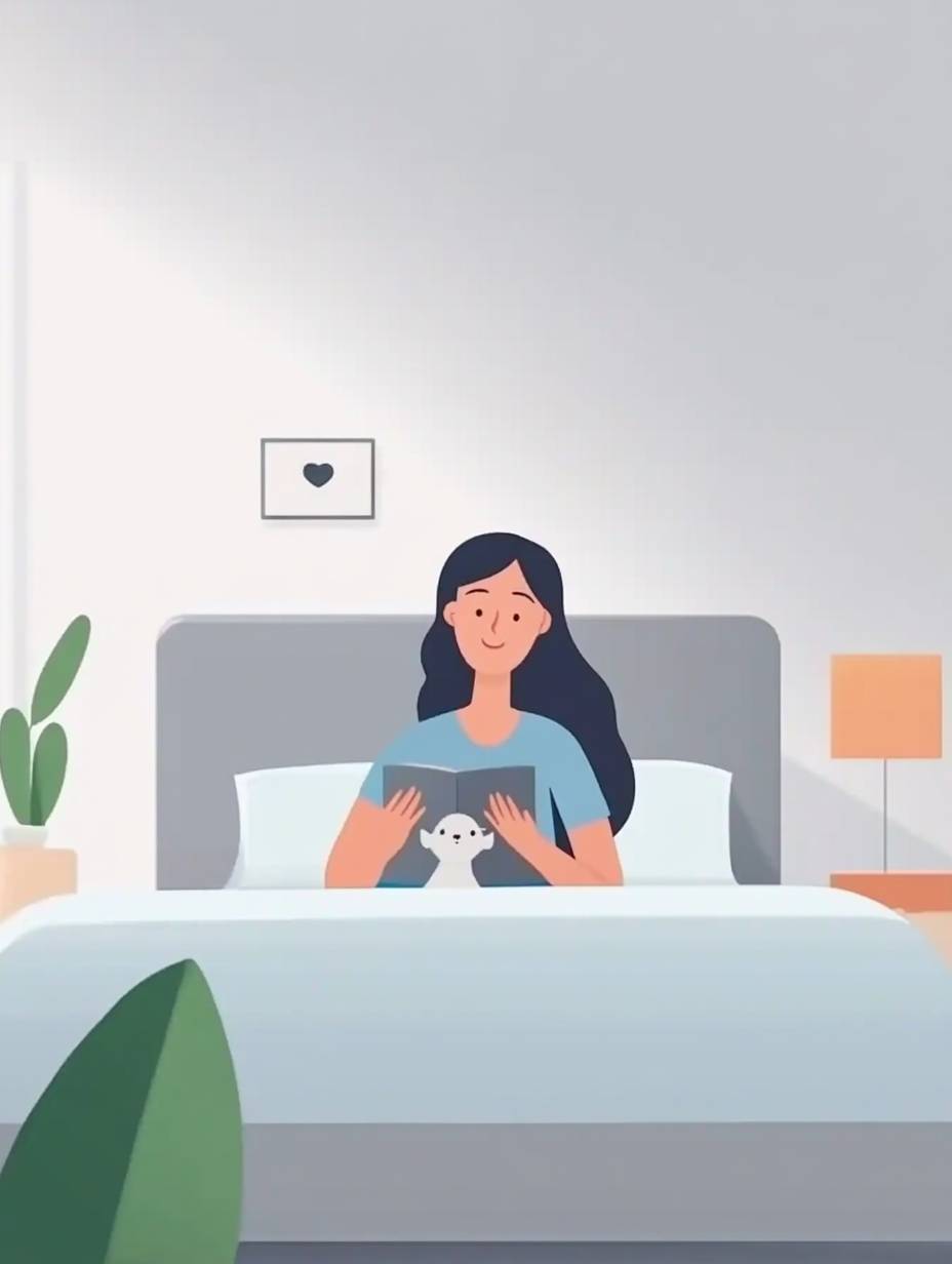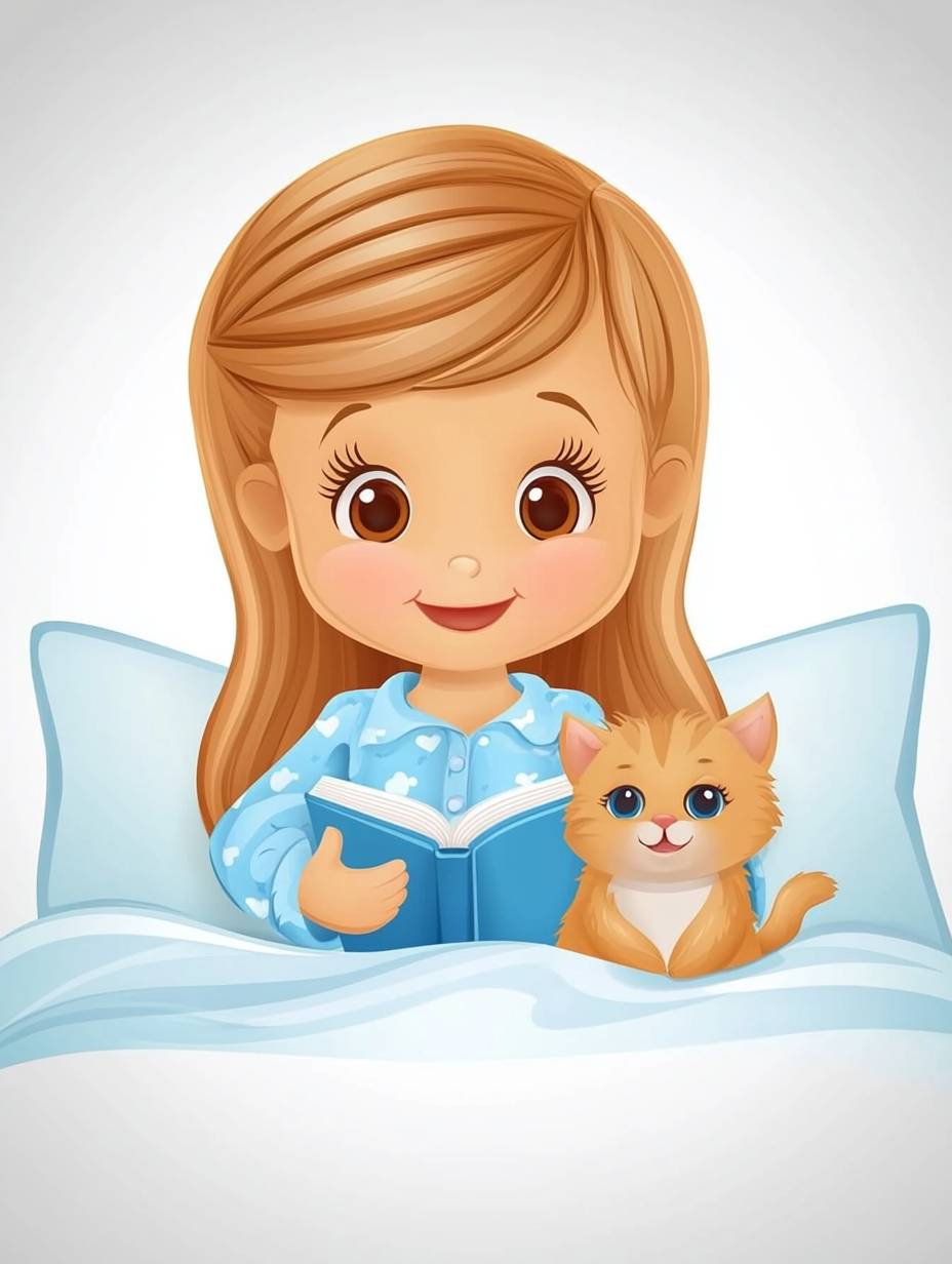 A beautiful girl with long hair, wearing blue pajamas and reading in bed, is holding her cat. The scene is set against light gray walls with a simple interior design style. The illustration is in a flat, vector style with a full-body portrait and a flat cartoon aesthetic. The colors are bright, the lighting is soft and warm, and the girl's expression is natural and cute. --chaos 50 --ar 3:4 --v 6.1