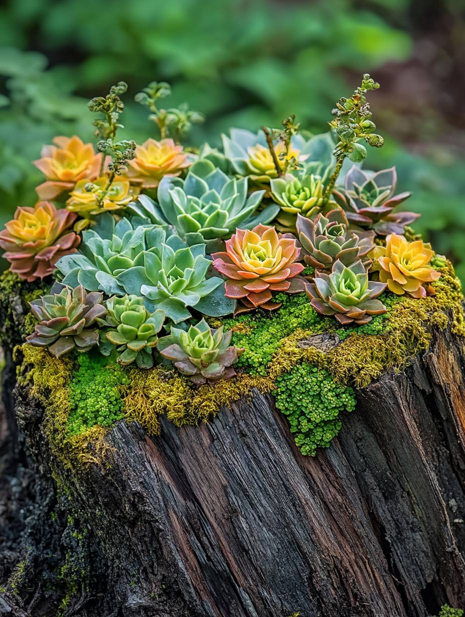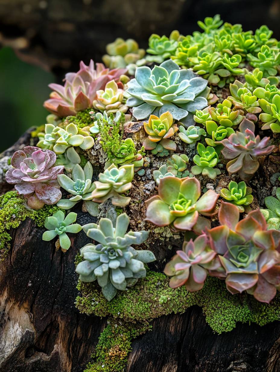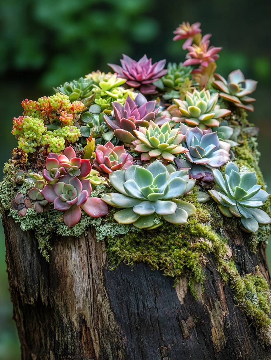 A piece of wood covered with moss and succulents, with many different kinds of succulents growing on it. This photo was taken outdoors in natural light. This is a close-up photo of a beautiful artwork made from an old tree stump. It is characterized by vivid colors and lush greens. Every plant has a lot of detail and texture, professional photography, extreme detail, ultra HD, super realistic.