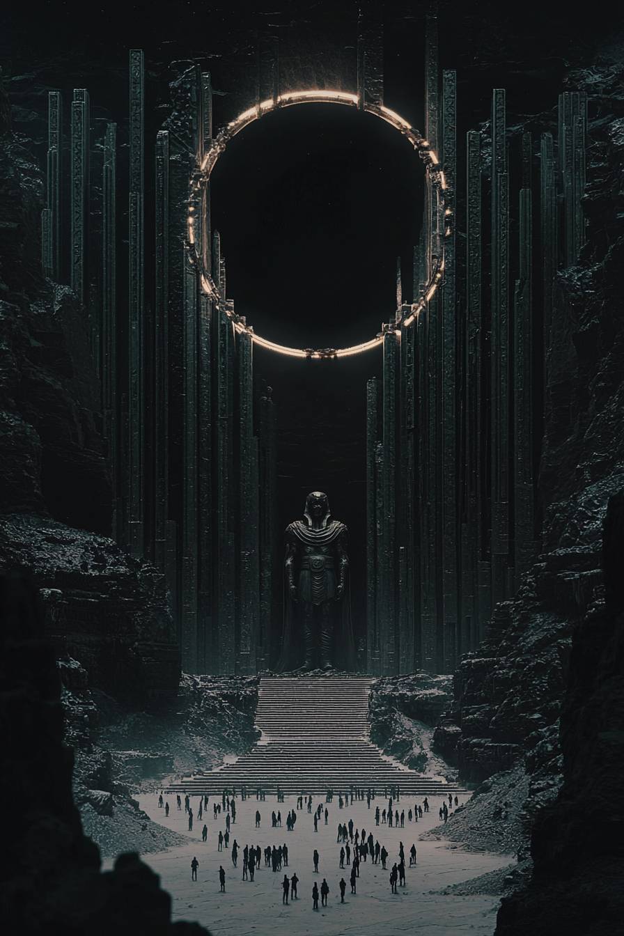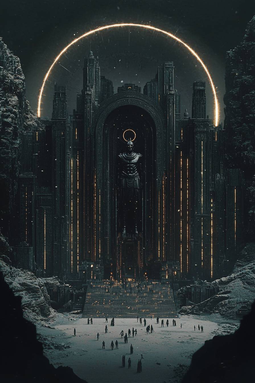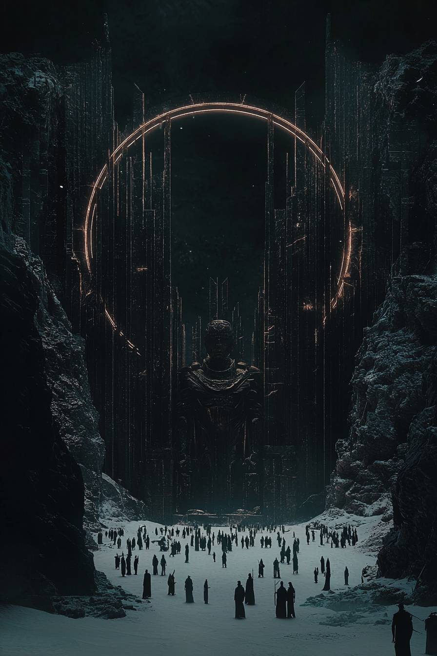 Extremely ultra wide cinematic shot of an ancient city surrounded by people, an enormous SOLDIER statue in the center of the city, circular light, mega structures carved in the mountains, intricate, highly detailed, --ar 2:3 --quality 2 --sref 3518835920 2837013301 2749571961 1177177668 --personalize df1ce3t --v 6.1