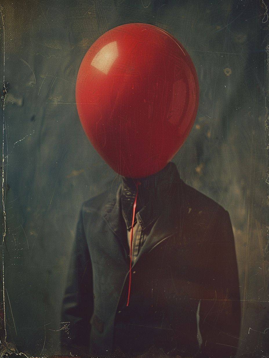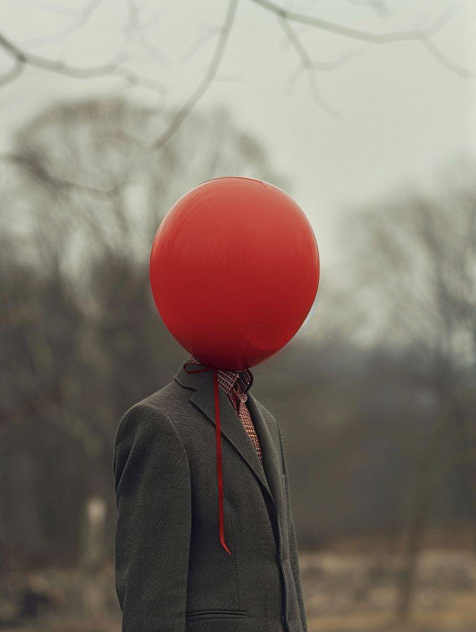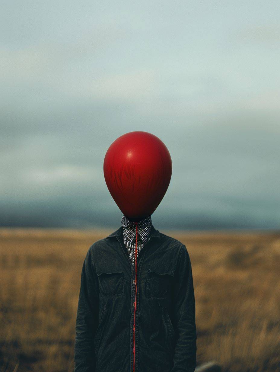 A man with a red balloon for a head, captured in real photography.