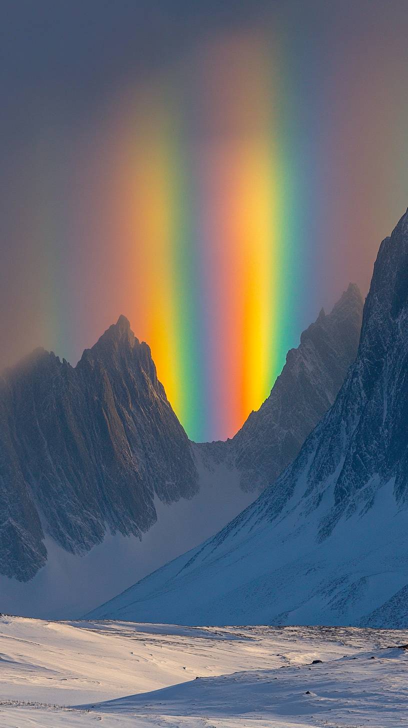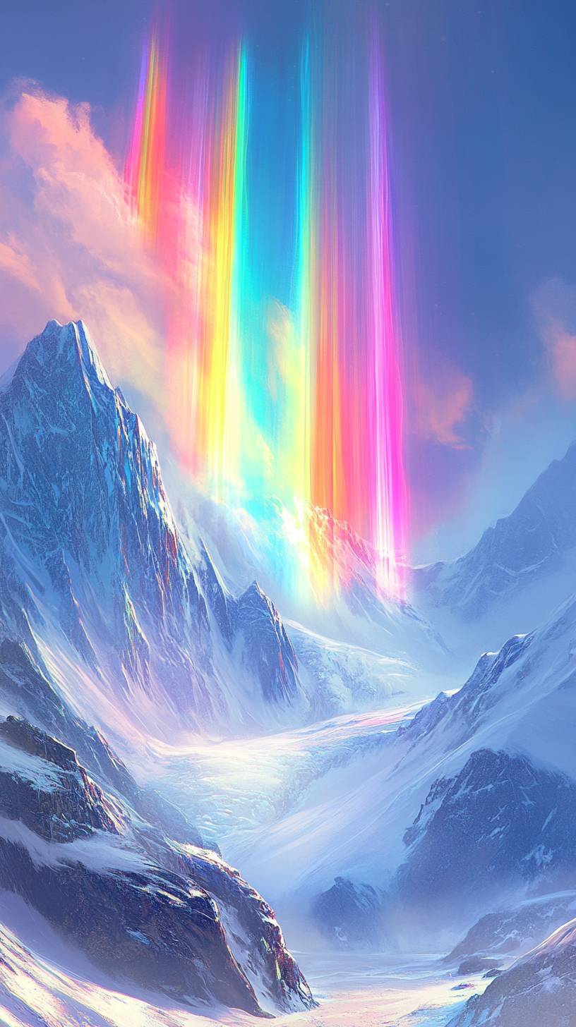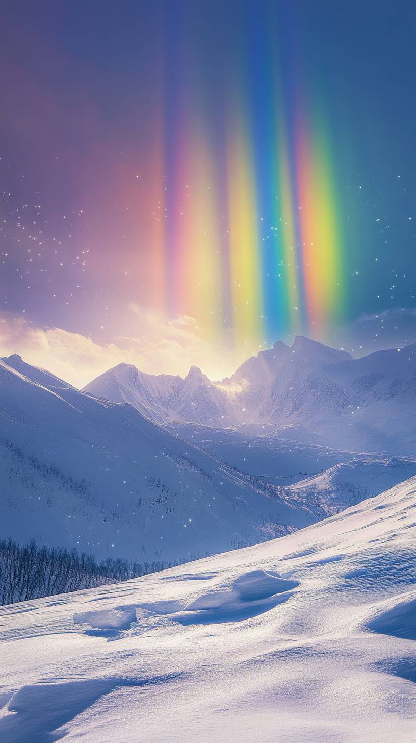Bright arctic landscape, sunshine, snow, mountains, bright, multiple vertical rainbows like tulle falling across the sky, multiple red, orange, yellow, green, blue, purple, rainbow after rainbow, daytime, glowing, fresh --ar 9:16 --v 6.1