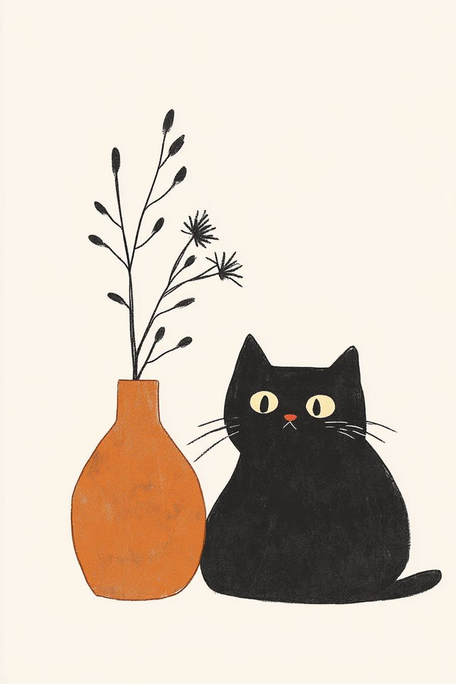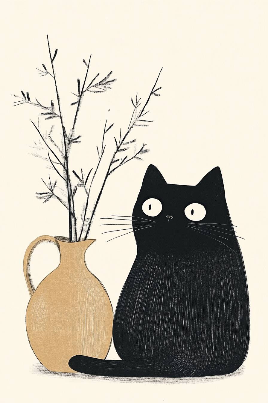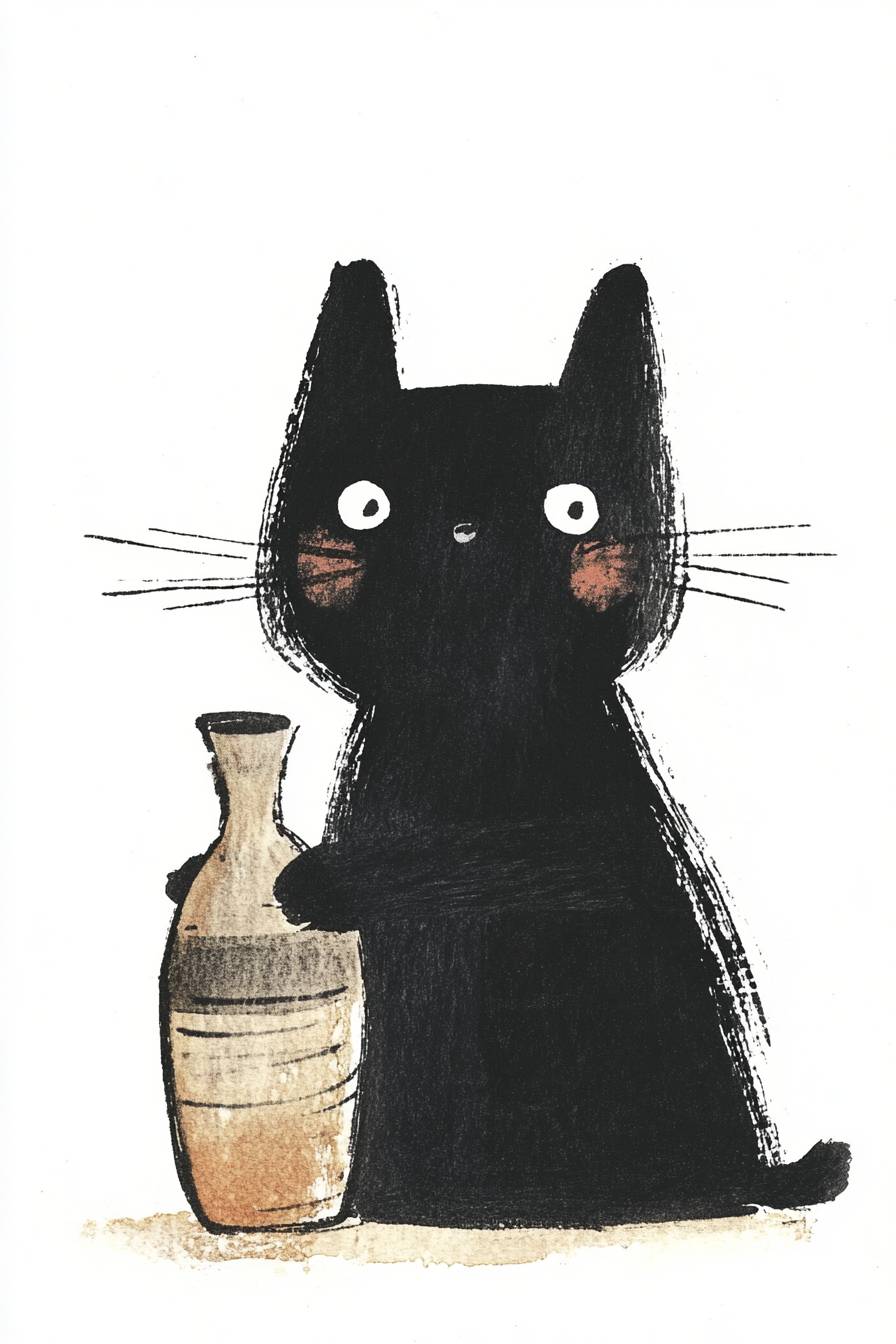 a cute black cat lying is holding a vase, white clean background, simple, minimalist, Chinese small brush pen Brief strokes. --ar 2:3 --v 6.1