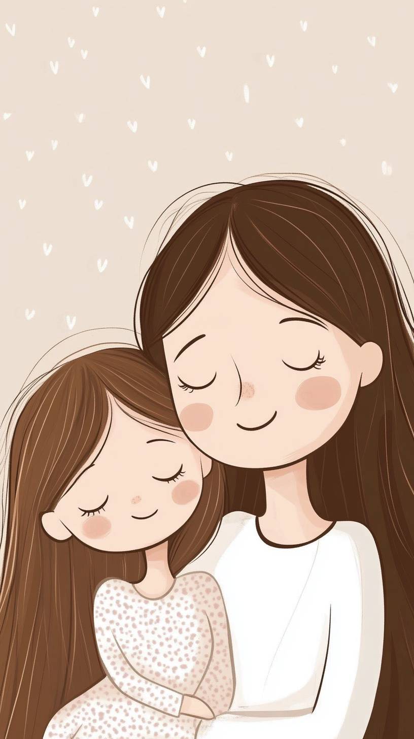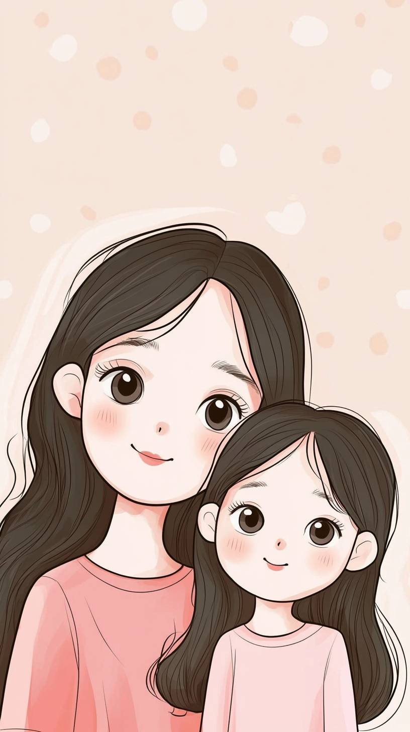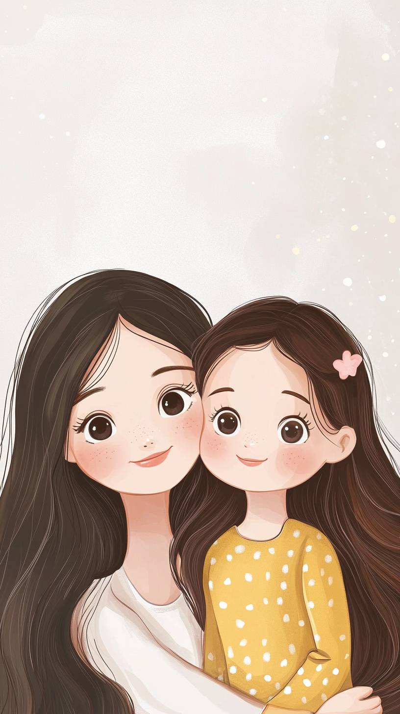 There are cartoon characters in the picture, mother and daughter, long hair and small eyes, cute style, national trend illustration --ar 9:16 --style raw --v 6.1
