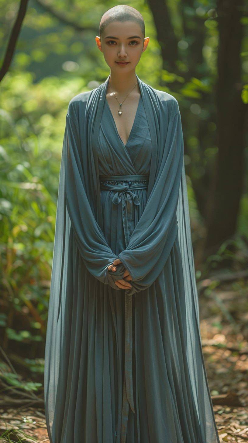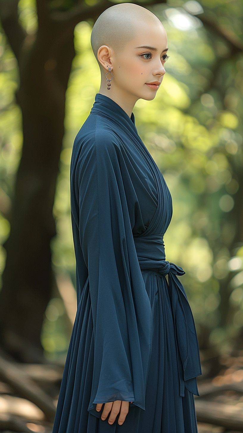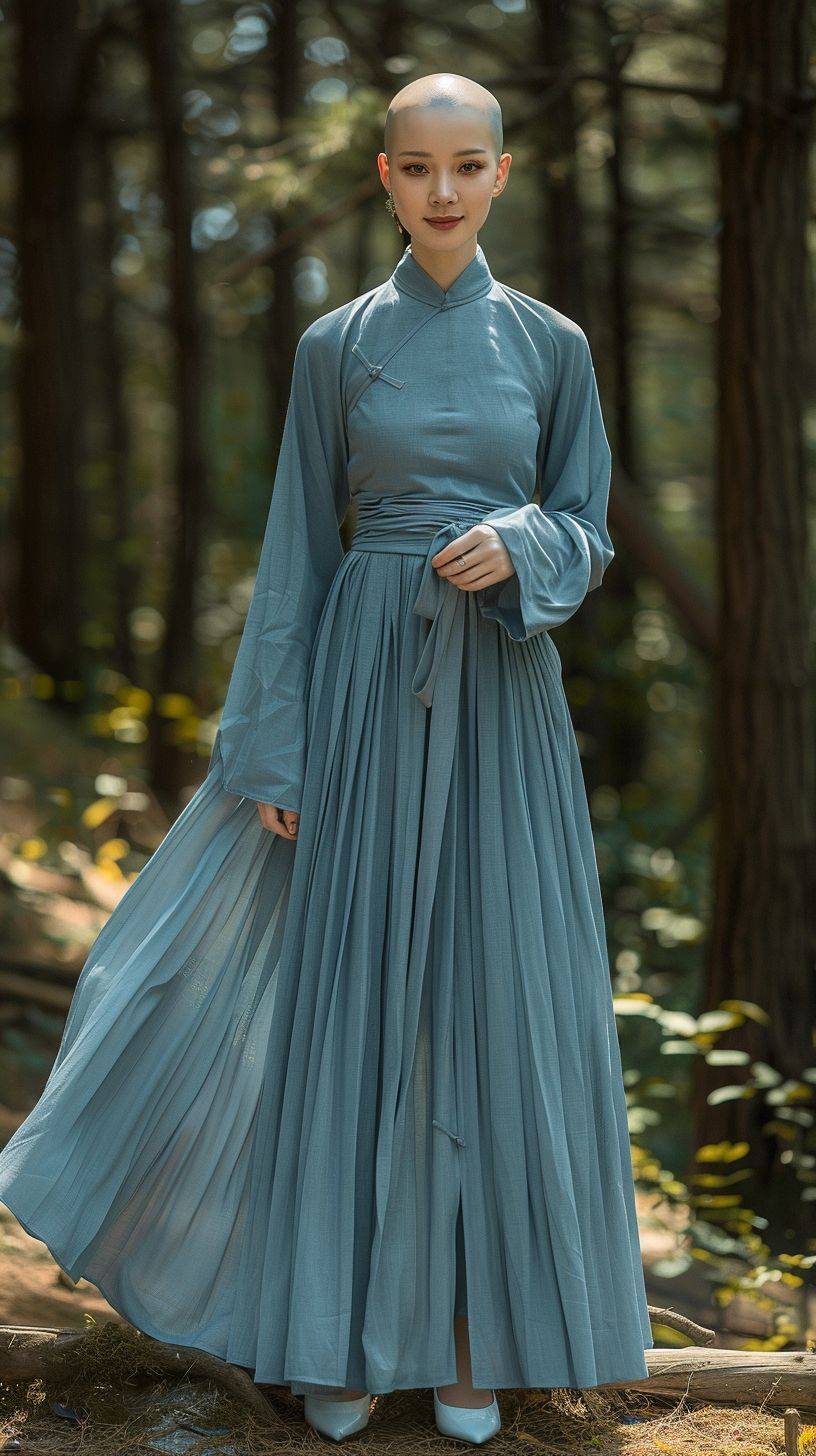 A Chinese woman, 20 years old, bald, Chinese monk image, real skin, delicate skin, fair and ruddy oval face, willow eyebrows, small nose, wearing a long blue dress, slender thighs, white high heels, the corners of her mouth slightly raised, standing in the sunny woods, smiling, taking a full-body photo from a distance, looking sideways at the camera --ar 9:16 --stylize 750 --weird 2