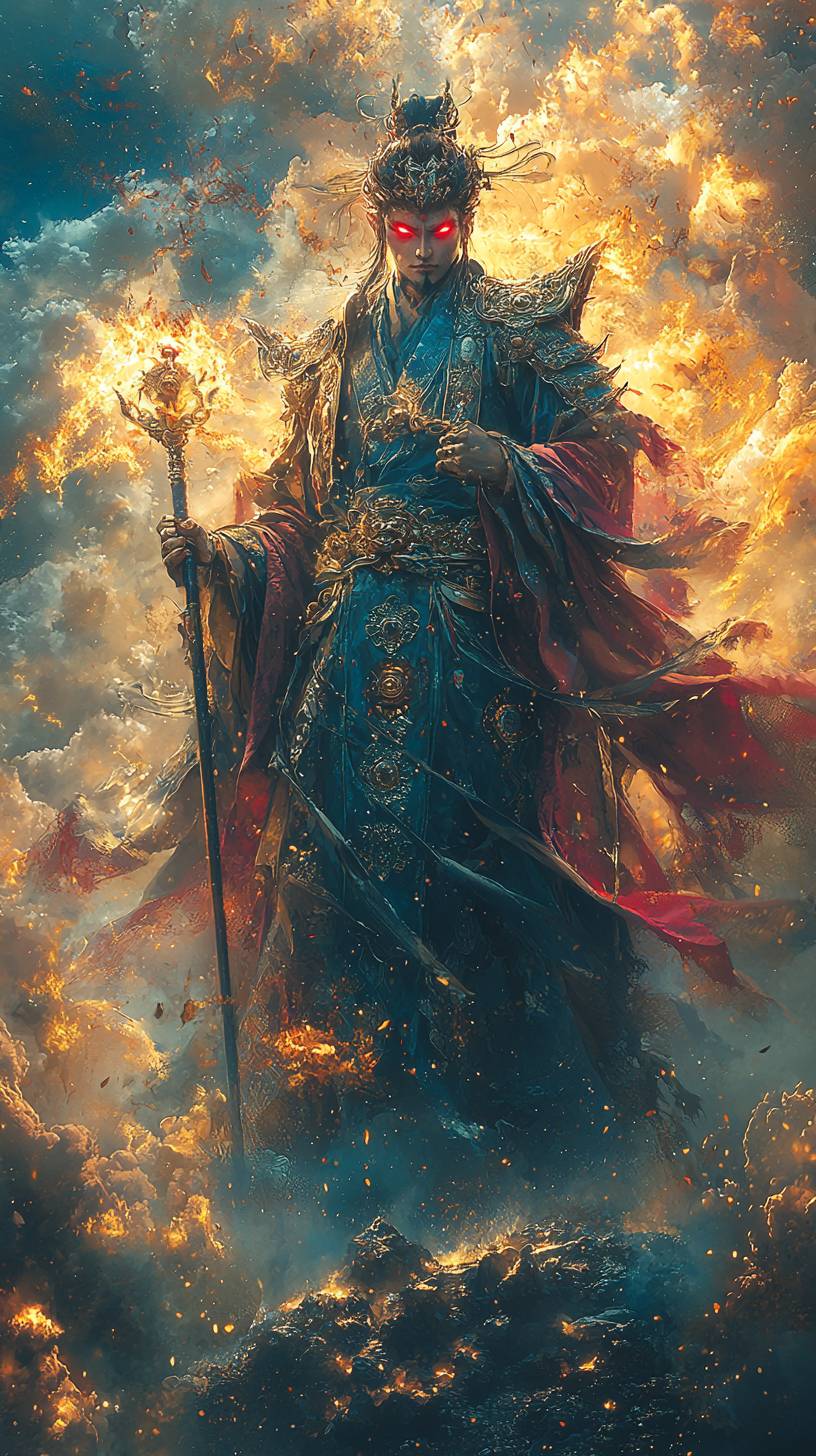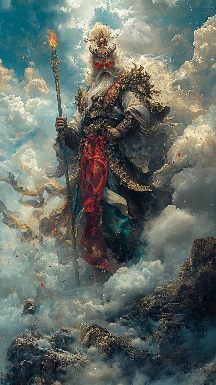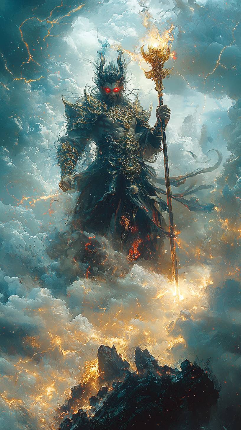 A Chinese mythological monster, holding a sword and a spear, holding a thunderbolt scepter, standing on an island, with red eyes, surrounded by thunderbolt energy, and wearing armor decorated with auspicious symbols. The background is storm clouds, with a strong contrast between light and dark, and the scene is dramatic. ,Details,,in --ar 9:16 --quality 2 --stylize 750 --v 6.1