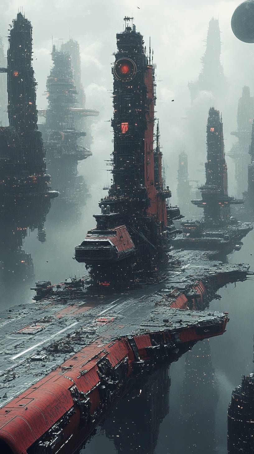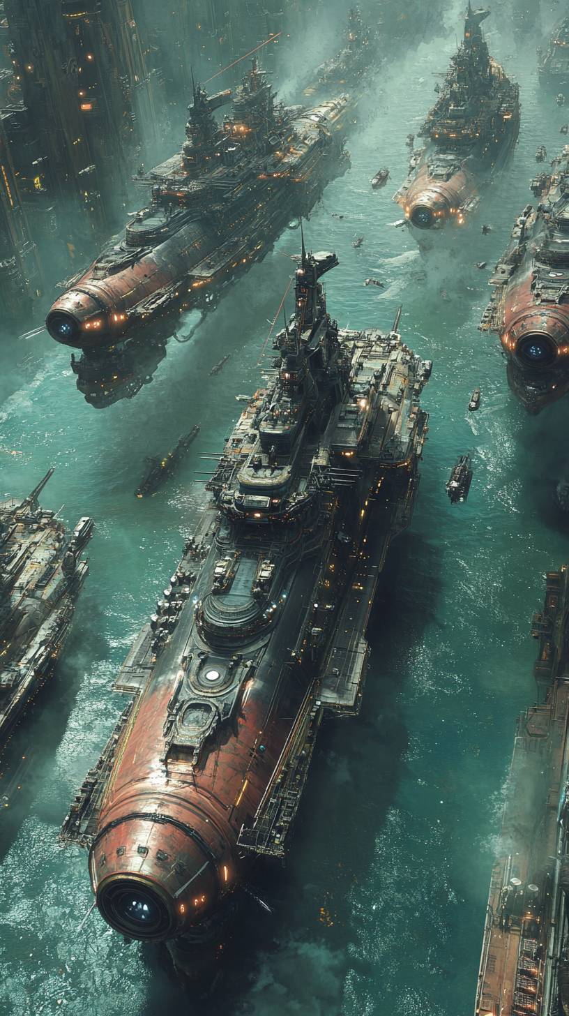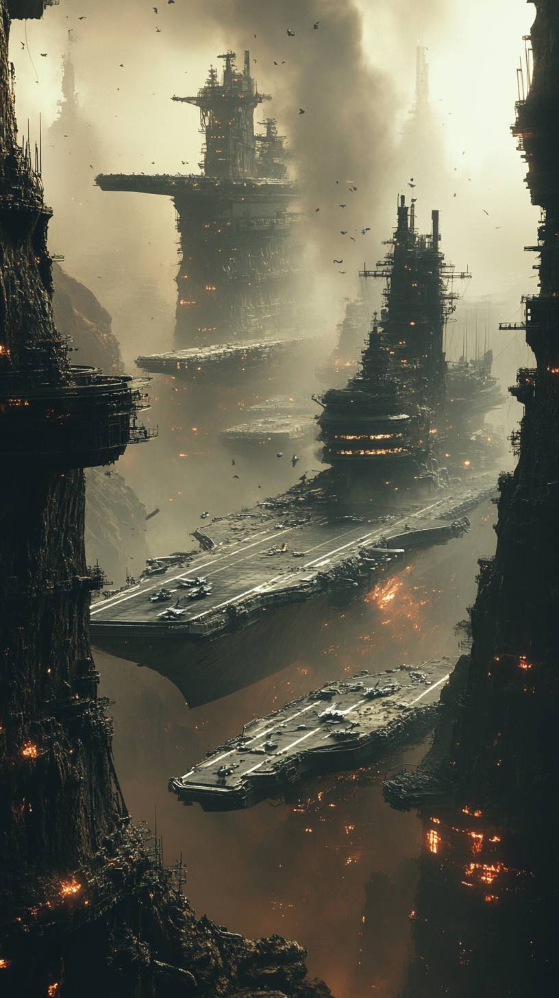 Create an image of a broken down fleet of futuristic ships including Aircraft carriers and destroyers. --chaos 7 --ar 9:16 --style raw --stylize 300 --v 6.1