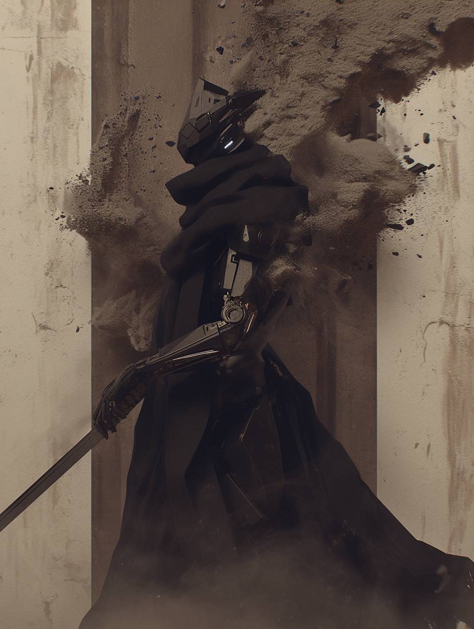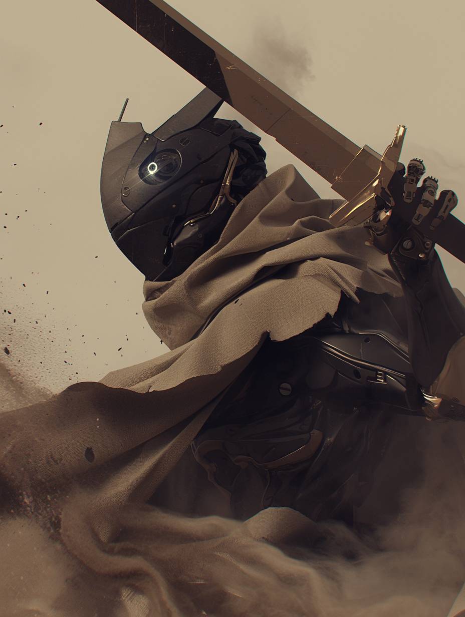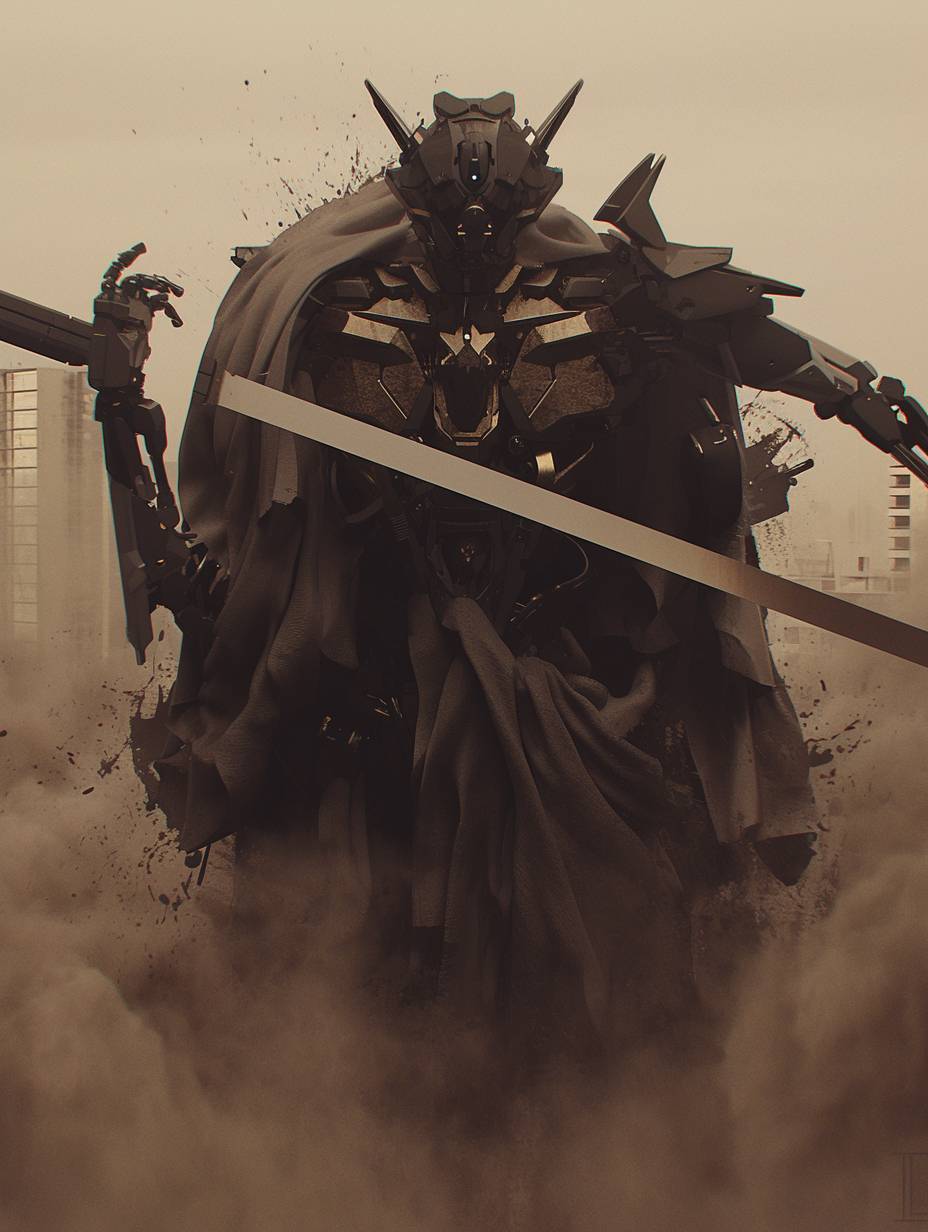 cyberpunk concept art style, synthetic revolution, black sleek armored robot emerging from dense sandstorm, imposing silhouette with pulsating blue eye, clutching formidable sword, sleek plating catching glints of light, ravaged futuristic cityscape, looming mechanical figure in turbulent setting, whirling sand vortex and crumbling skyscrapers in background, ominous robotic titan in foreground, muted brass and tarnished gold atmospheric lighting, antique gold and patina color palette, --ar 3:4 --style raw --sref 2939510903 --niji 6