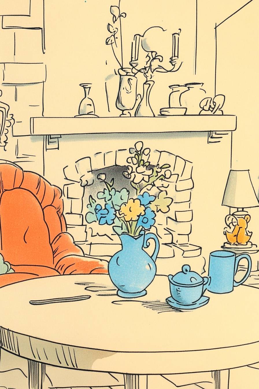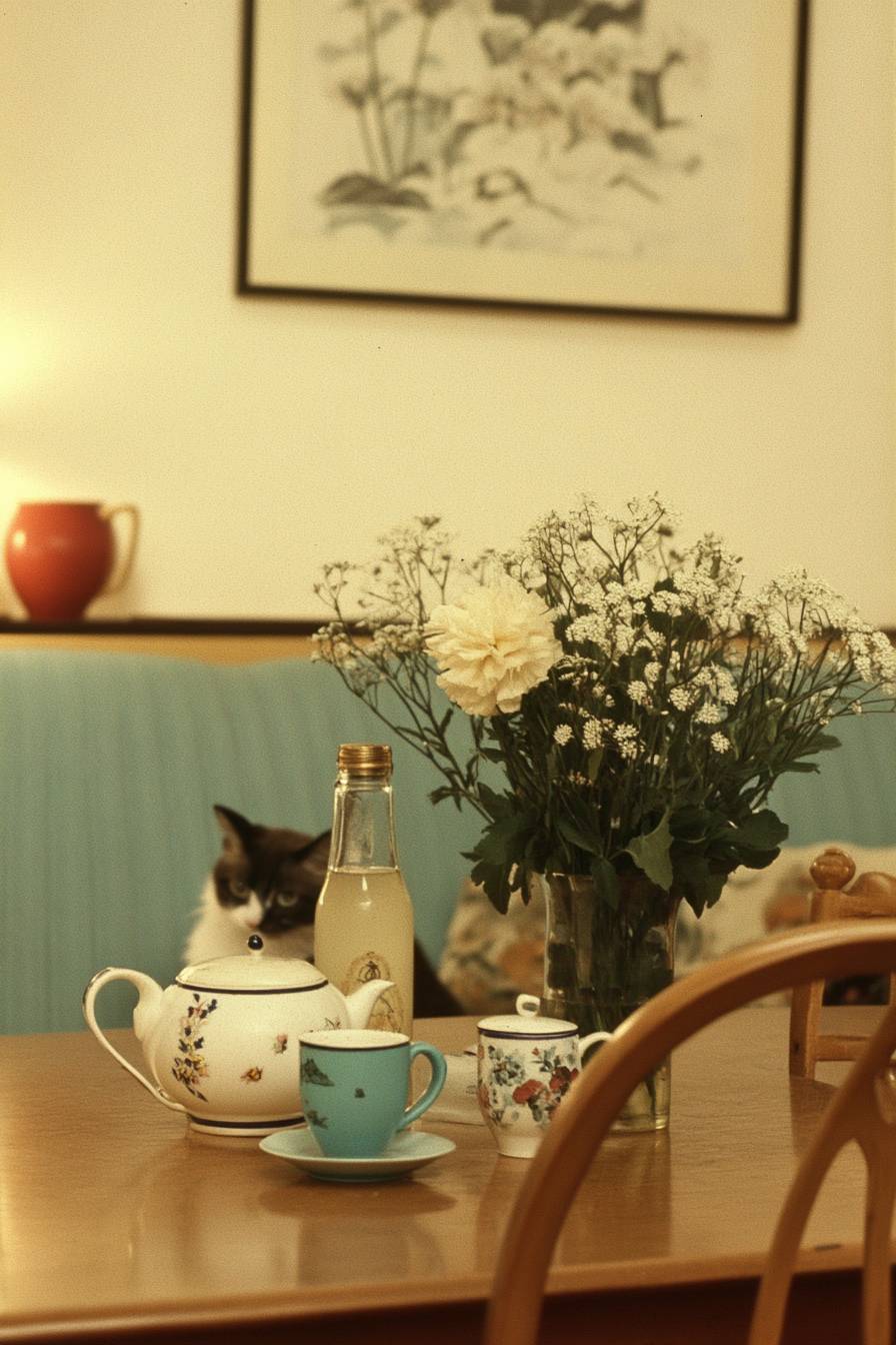 A dining table in the living room with a bottle of flowers, a cat, a tea set, a mug --sref 160004952 --sw 120 --v 6.1 --ar 2:3