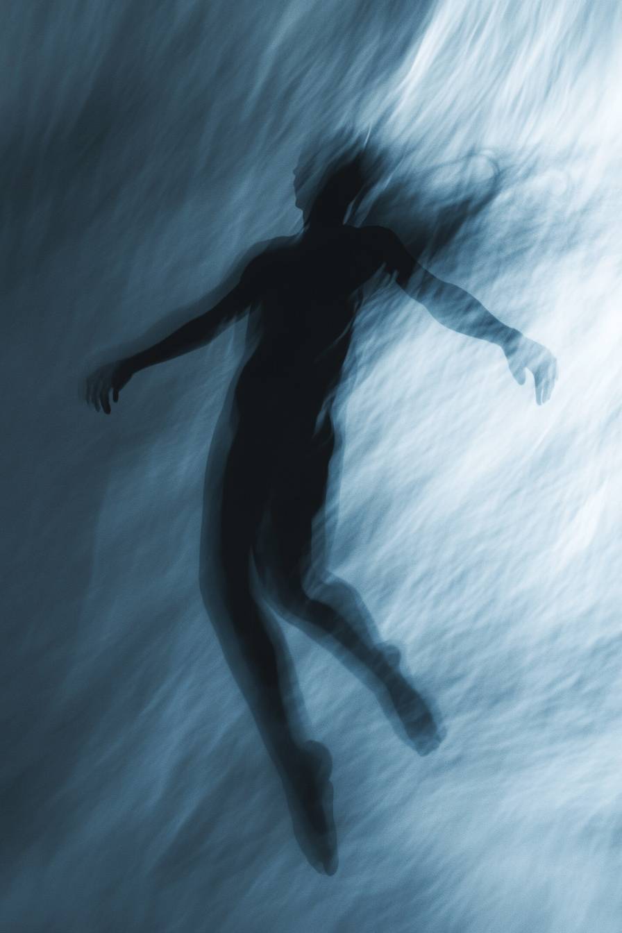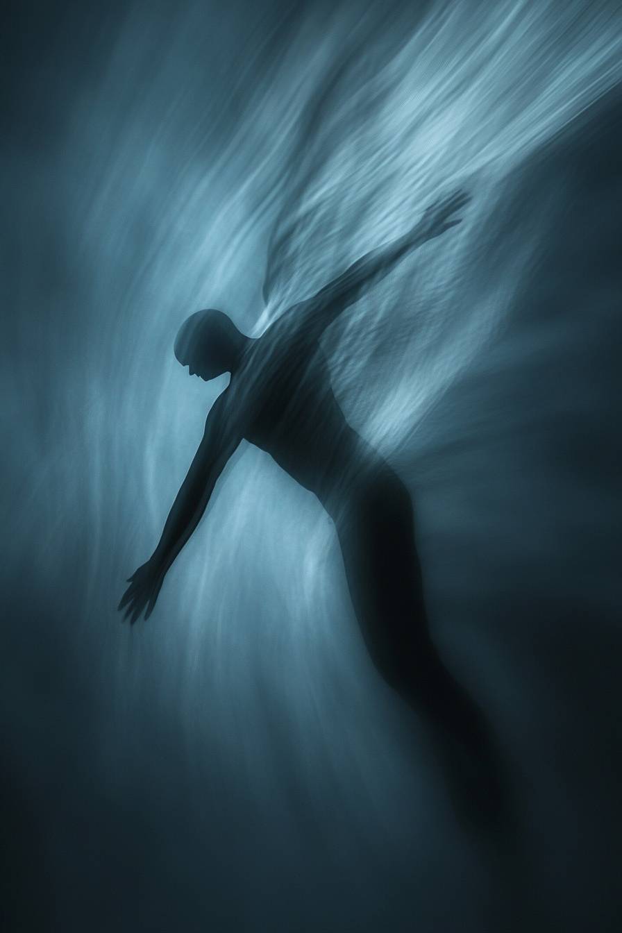motion blur downfall, body silhouette of a falling angel, conceptual and minimalist, dark grey blue shades, in the movement