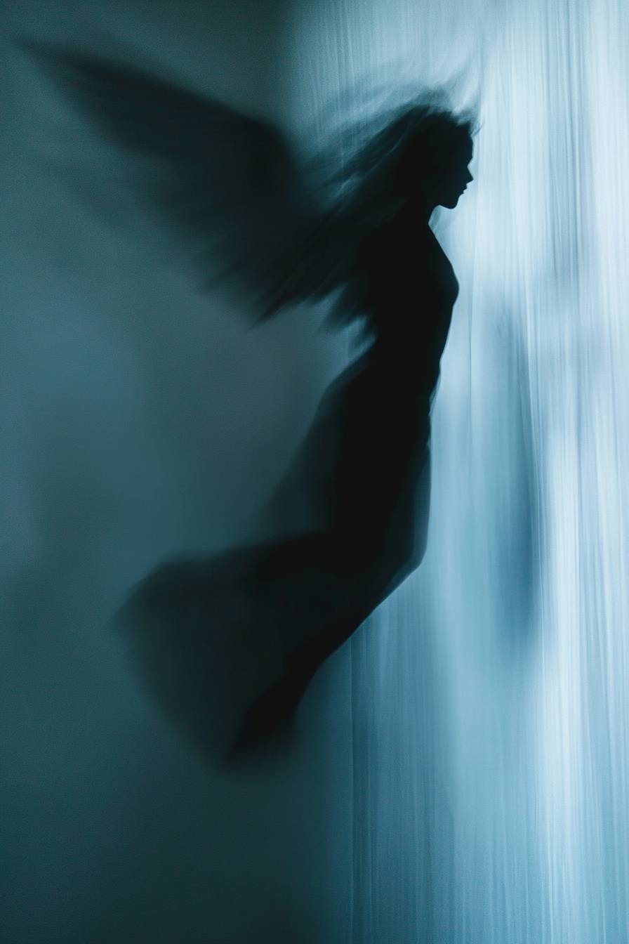 motion blur downfall, body silhouette of a falling angel, conceptual and minimalist, dark grey blue shades, in the movement --ar 2:3 --v 6.1