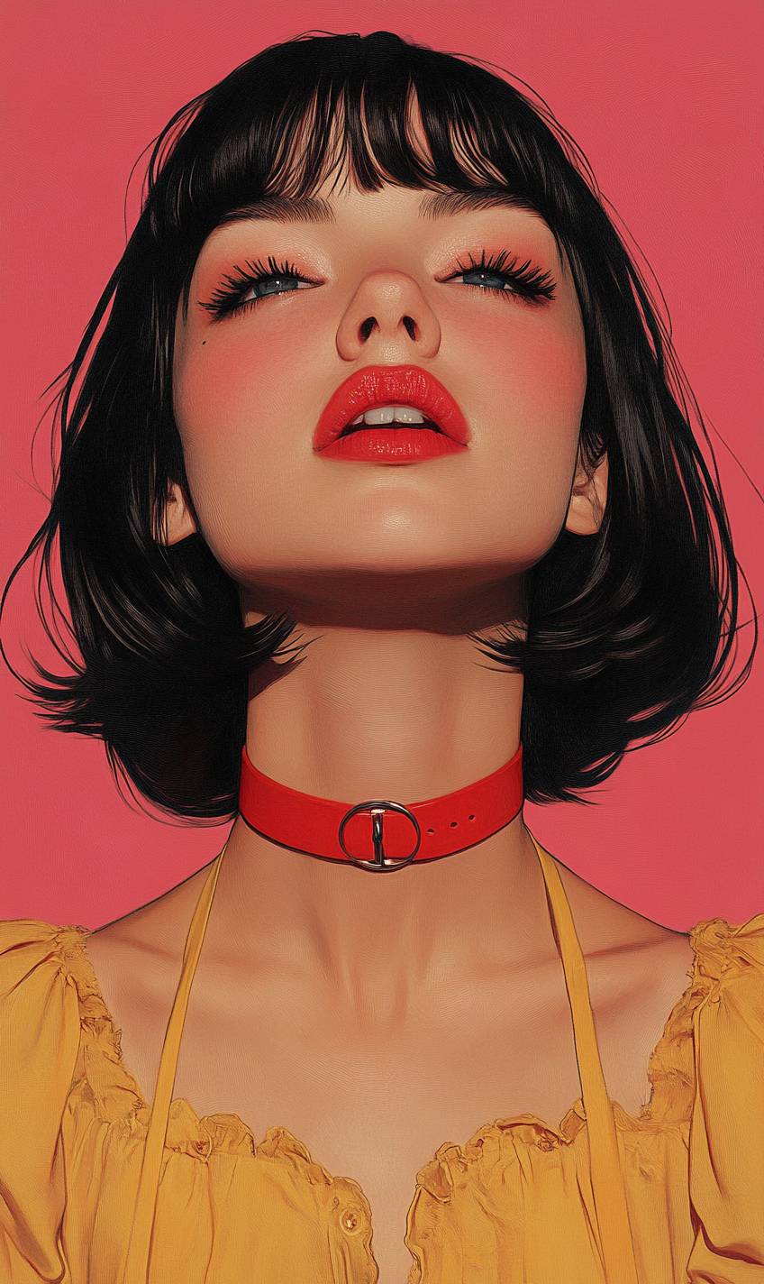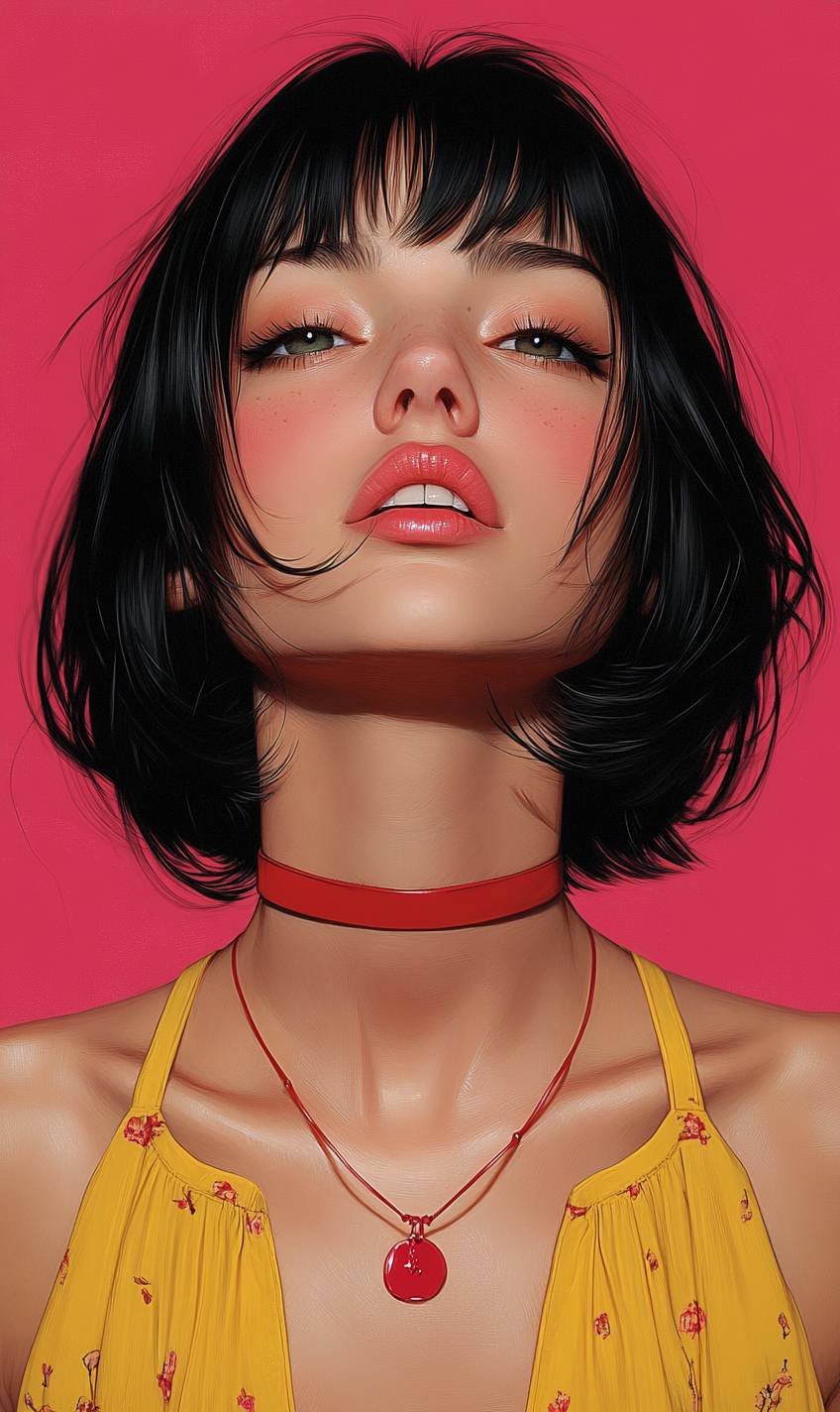 A detailed illustration of a woman with a black bob haircut, wearing a yellow dress and a red choker necklace, with a pink background.