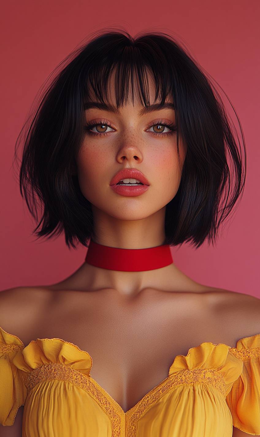 detailed Illustration of a woman with a black bob haircut, yellow dress, and a red choker necklace. pink background --stylize 800 --v 6.1 --ar 3:5
