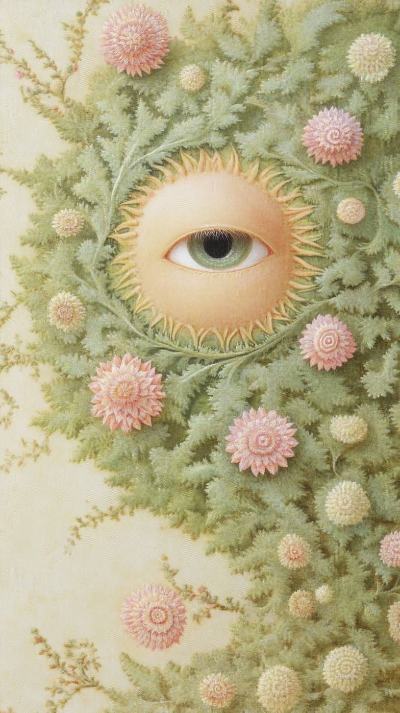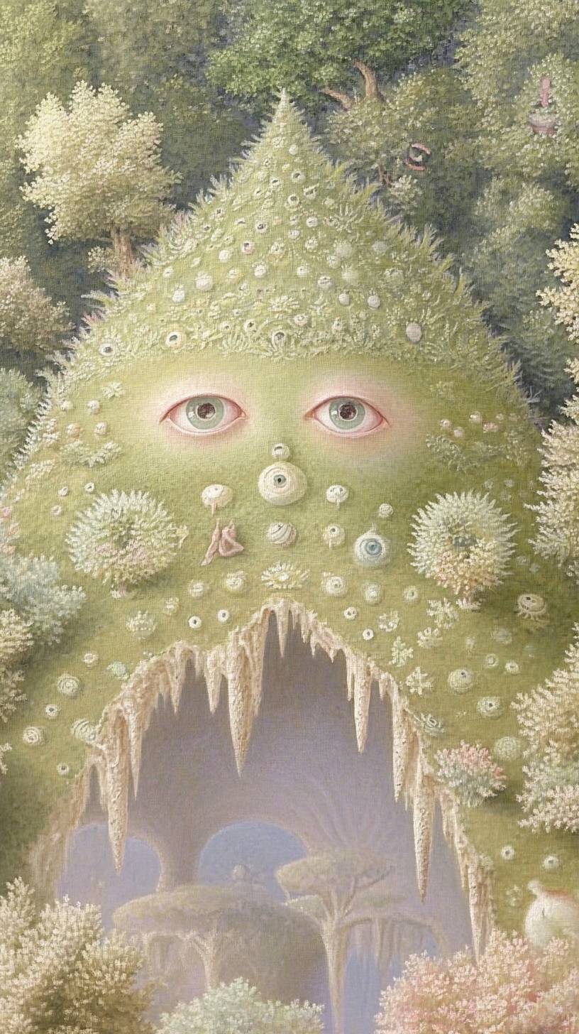A close-up of the trunk and bark of an aspen tree with eyes etched into it. It resembles a beautiful mystical fairy and covered with green mossy patches and multiple water lilies. The background is a mossy bog. The artwork is in green, blue and red highlights.::1 Mandala, Abtract, Fractalism, Islamic patterns. Surrealism, third eye. psychedelic, dimethyltryptamine, lysergic acid diethylamide.::1 Abtract, Fractalism, Islamic religous patterns.::1 --chaos 3 --ar 9:16 --sref 4222964725 --v 6.1