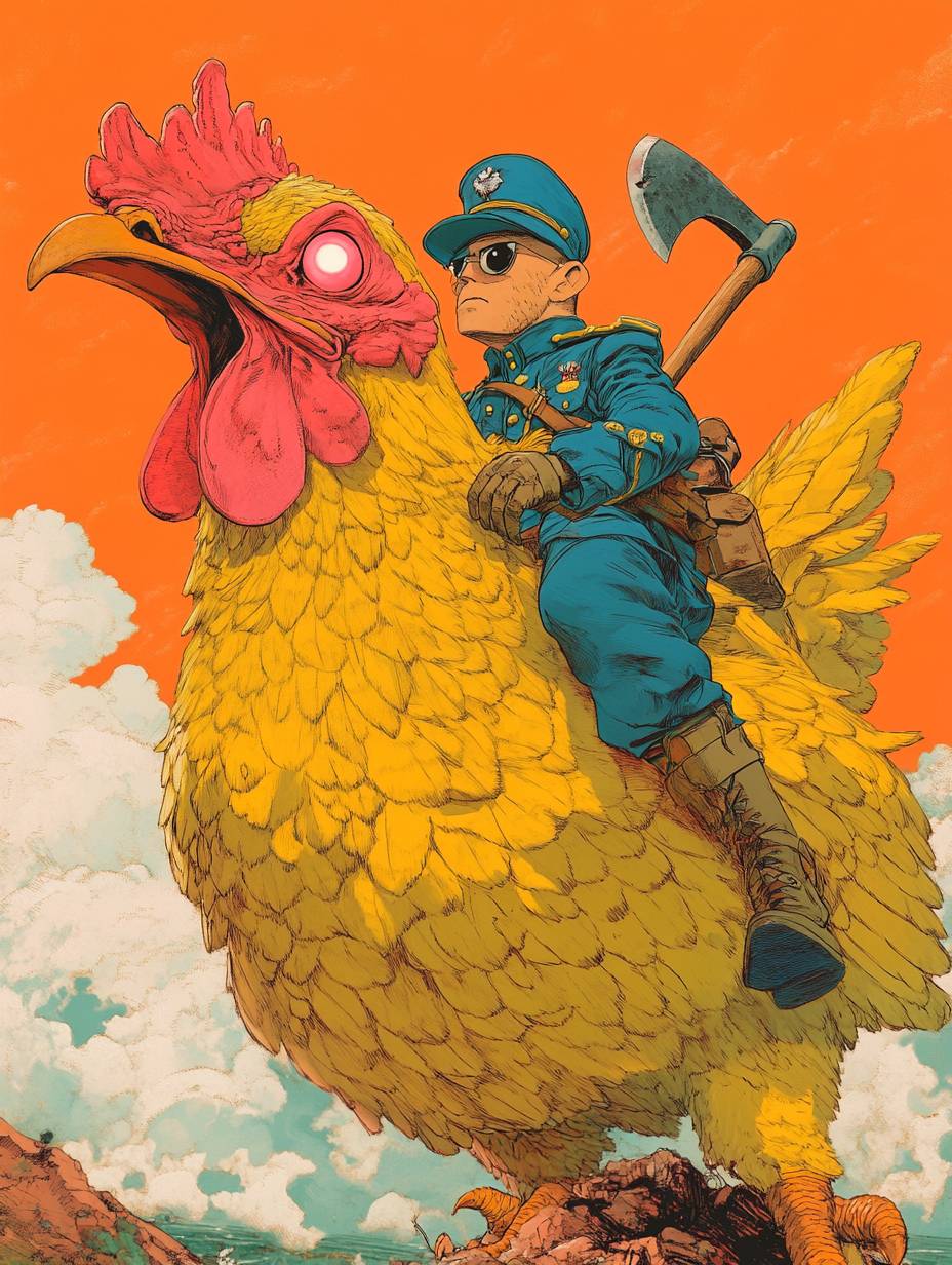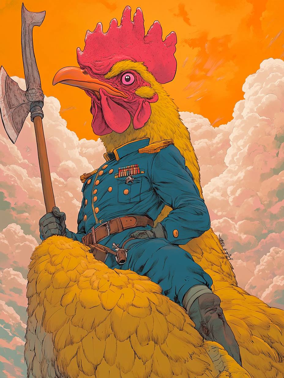 A man in a blue military uniform rides on the back of an anthropomorphic, giant yellow chicken with a long red beak and big pink eyes. In his hands, he holds an axe. The background is an orange sky with white clouds, in the style of Atey Ghailan and Moebius. --ar 3:4 --v 6.1