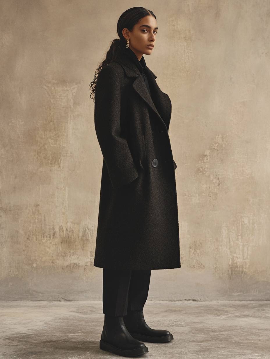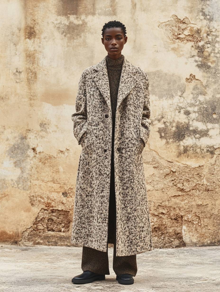 A full-body shot of a supermodel against a light-colored mottled wall.