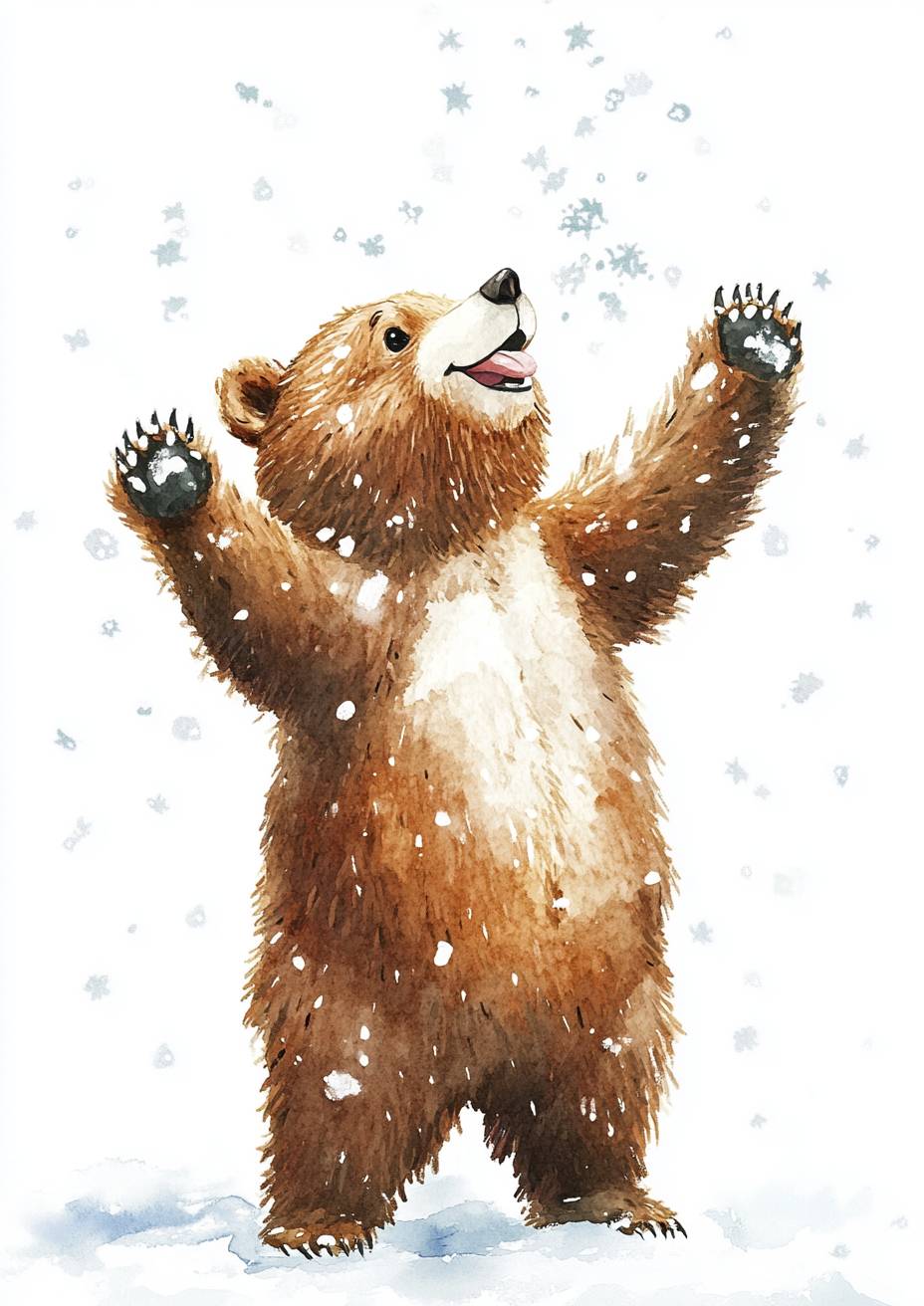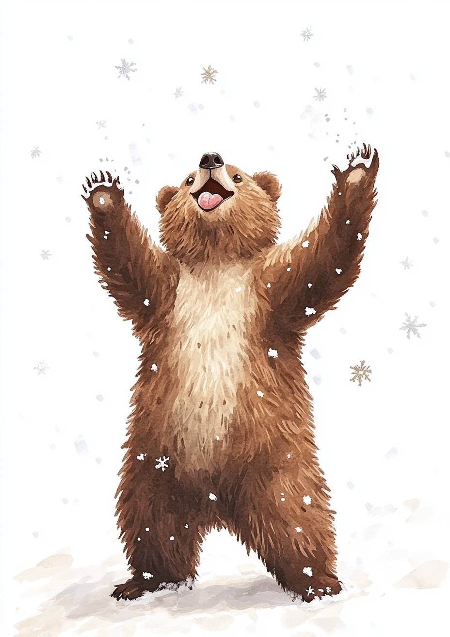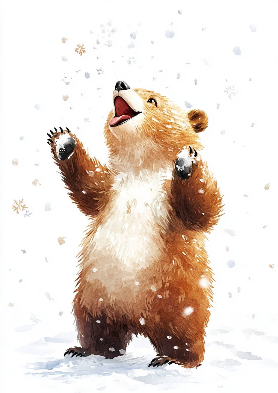 A cute bear standing on its hind legs, looking up at the sky with snowflakes falling around it, smiling and laughing. trying to catch snowflakes on the tongue. White background. Watercolor style. Children's book illustration. --ar 5:7 --v 6.1