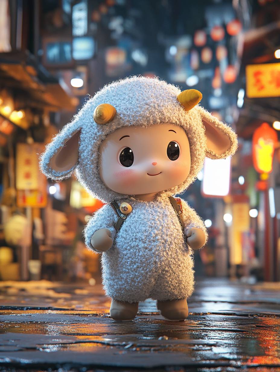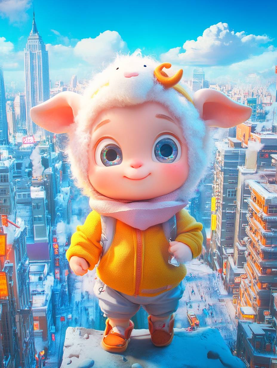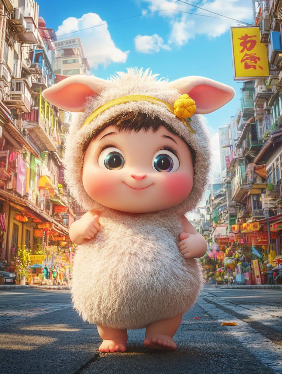Mascot logo, a cute 2-year-old baby, chubby, wearing a small lamb-shaped headband, standing in an 8K city street scenery