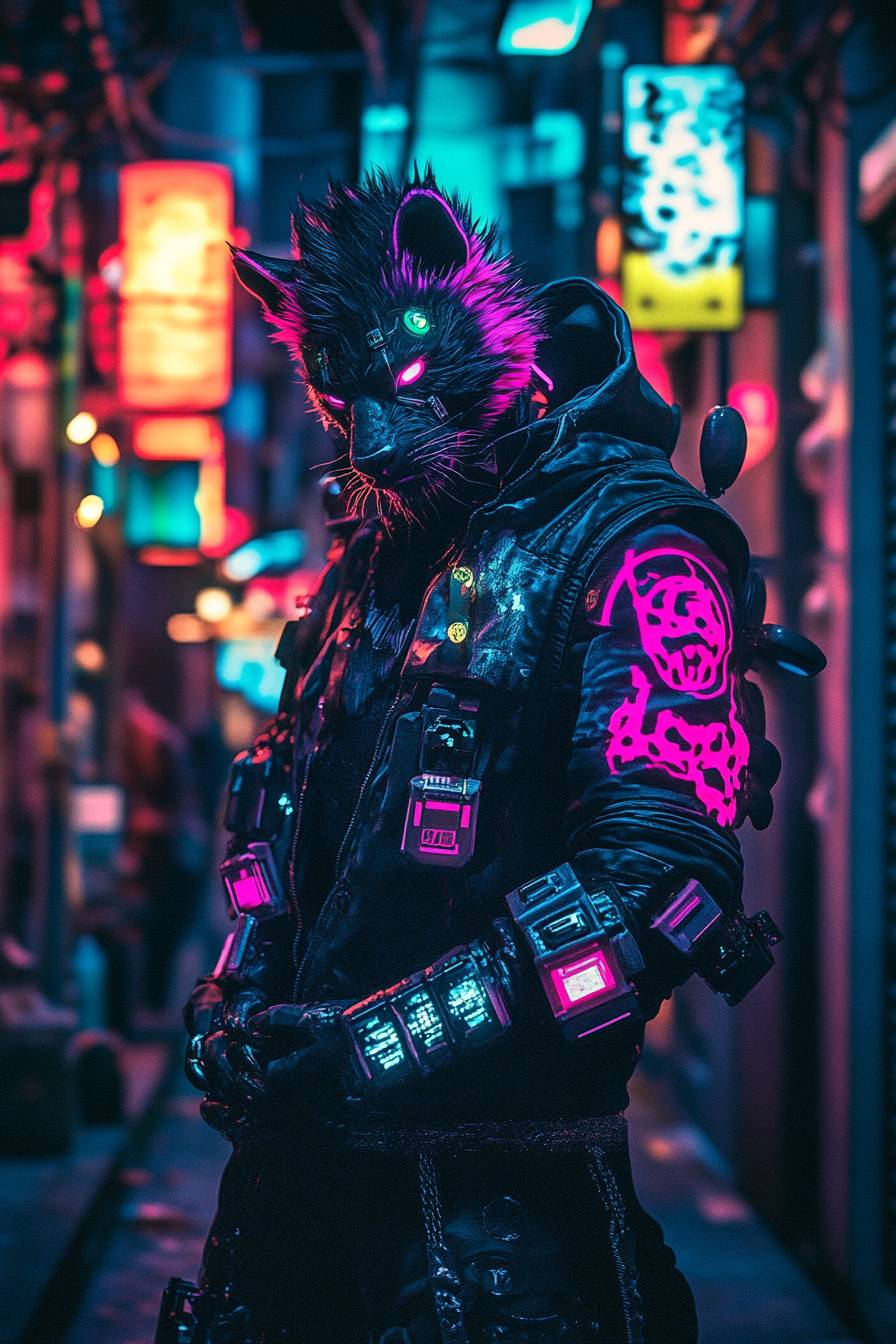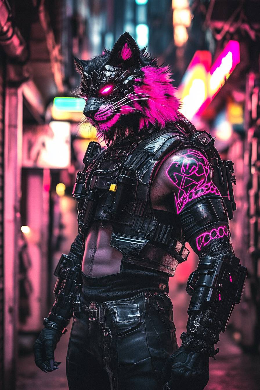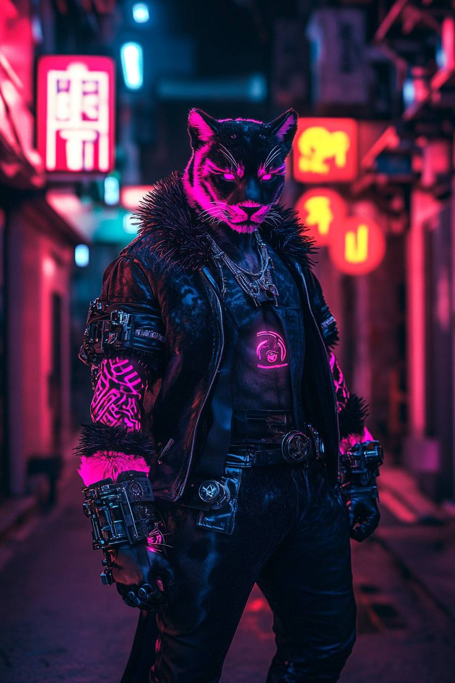 cyber angry [panther] man with bright [black and pink] fur, featuring intricate biopunk tattoos on his arms, standing in a dark alley filled with neon lights, displaying advanced biotechnology gadgets attached to his outfit --v 6.1 --ar 2:3