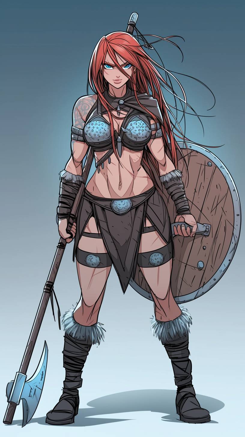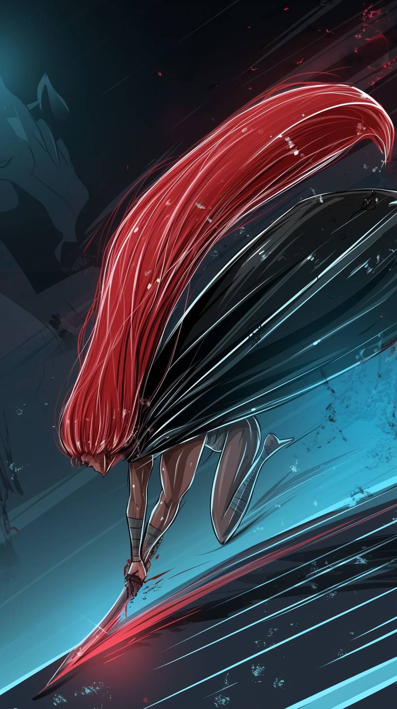 A simple drawing of Red Sonja, in the style of Allie Brosh with simple lines, flat colors and a stick figure, minimalistic, simple background --ar 9:16 --style raw --sref 2761035304 --niji 6