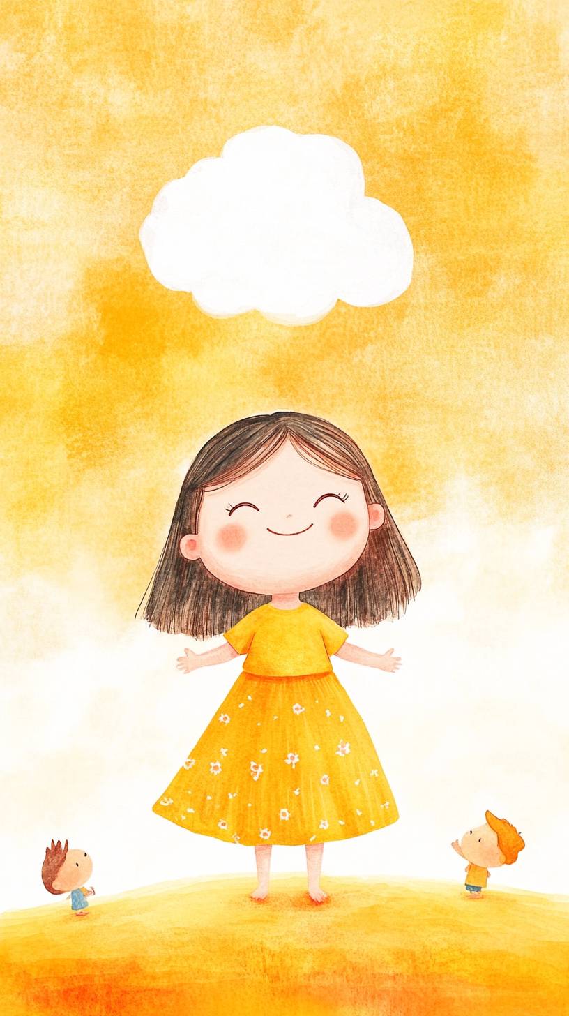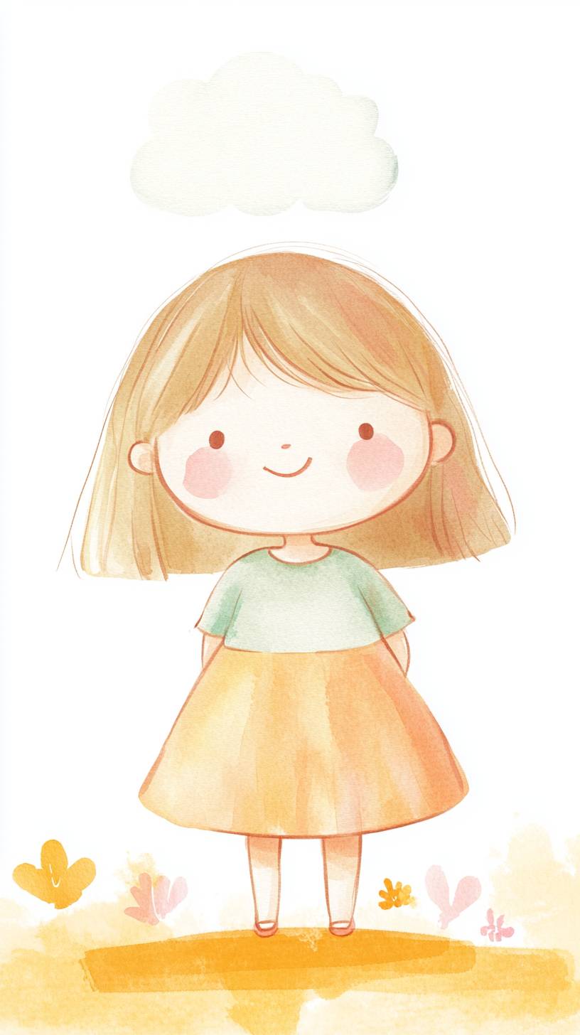 Watercolor paper creation, flat illustration, stick figure, pencil light color, minimalist lines, lovely fat round face baby girl, happy face, fat belly, lovely skirt, on the yellow beach, a white cloud on the top of the head, bulging face, white background, lovely cartoon design, soft lighting, warm colors, smiling expression, big eyes, chubby cheeks, pink blush on cheekbones, characters below the picture, large area of white space at the top, high detail, high resolution --ar 9:16 --style raw --v 6.1