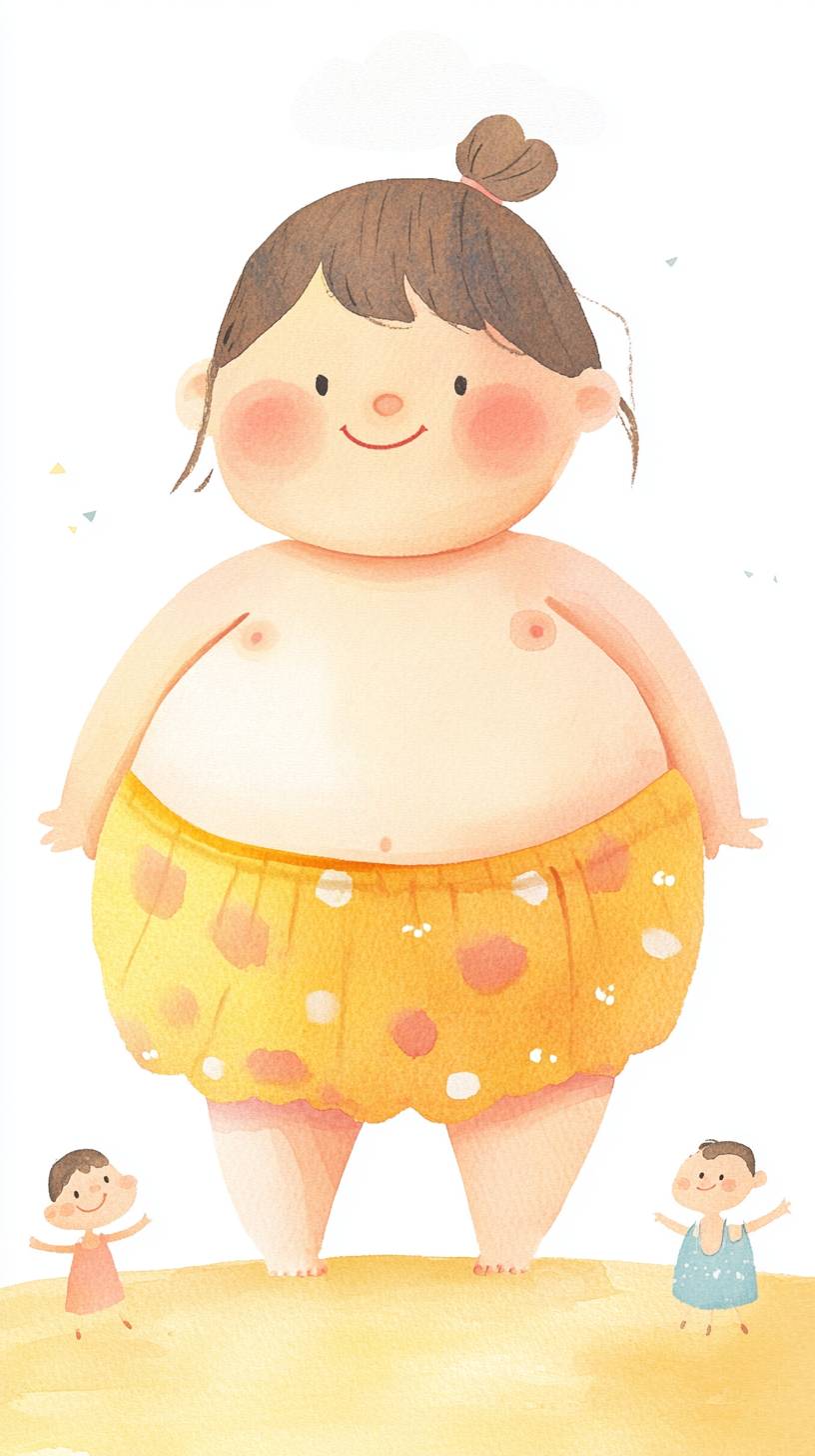 Watercolor paper creation, flat illustration, stick figure, pencil light color, minimalist lines, lovely fat round face baby girl, happy face, fat belly, lovely skirt, on the yellow beach, a white cloud on the top of the head, bulging face, white background, lovely cartoon design, soft lighting, warm colors, smiling expression, big eyes, chubby cheeks, pink blush on cheekbones, characters below the picture, large area of white space at the top, high detail, high resolution
