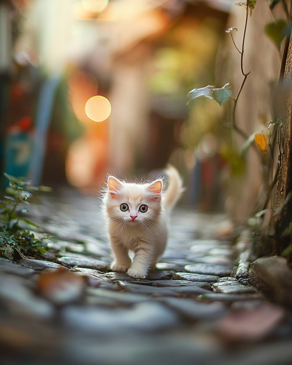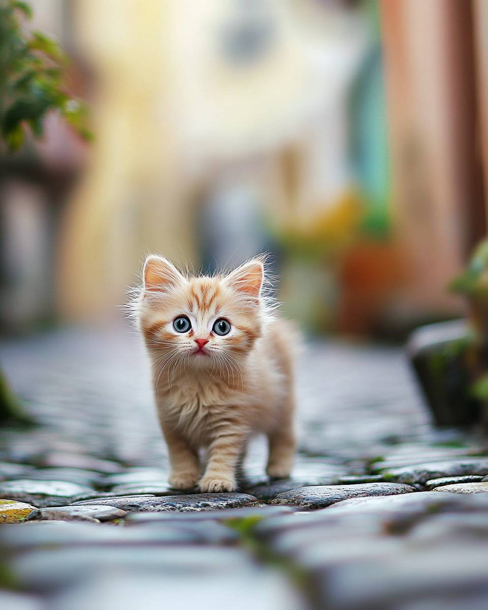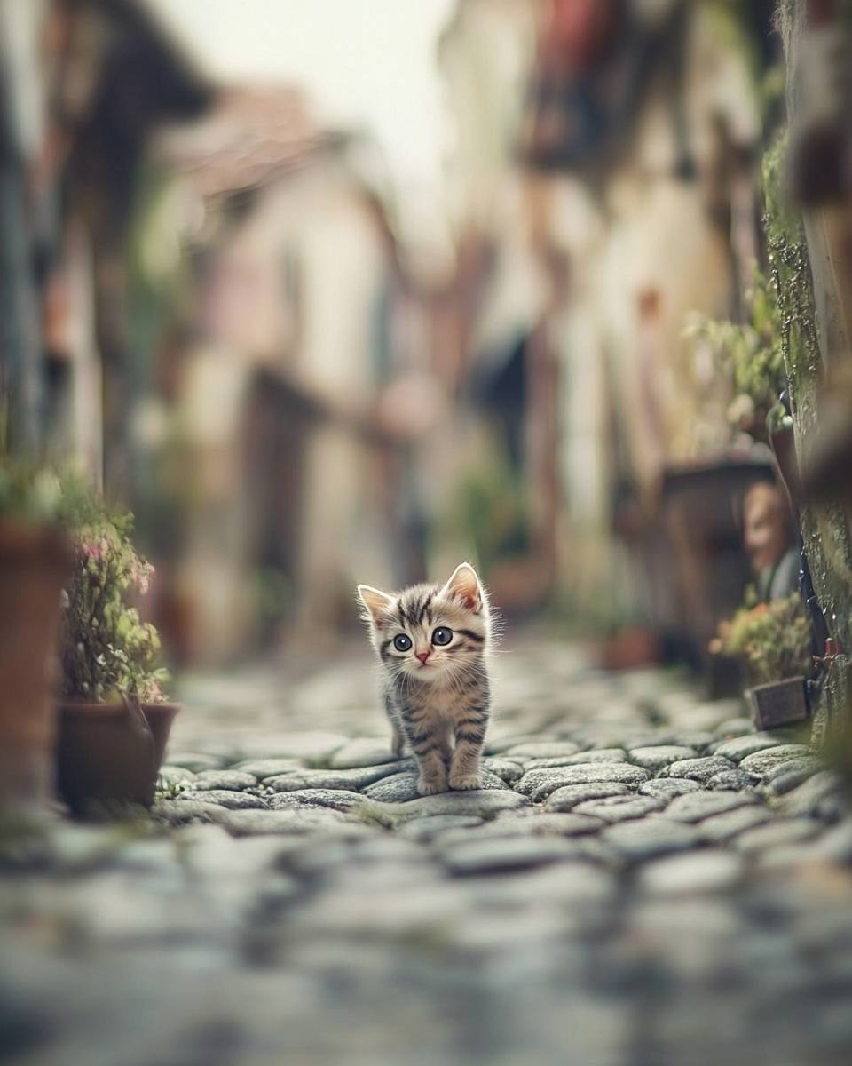 Adorable munchkin kitten exploring a magical miniature city, cobblestone streets, tiny buildings, whimsical details, soft pastel colors, dreamy atmosphere, cute expression, fluffy fur, wide-eyed wonder, macro photography, tilt-shift effect, shallow depth of field, 4K, highly detailed --ar 4:5 --v 6.1