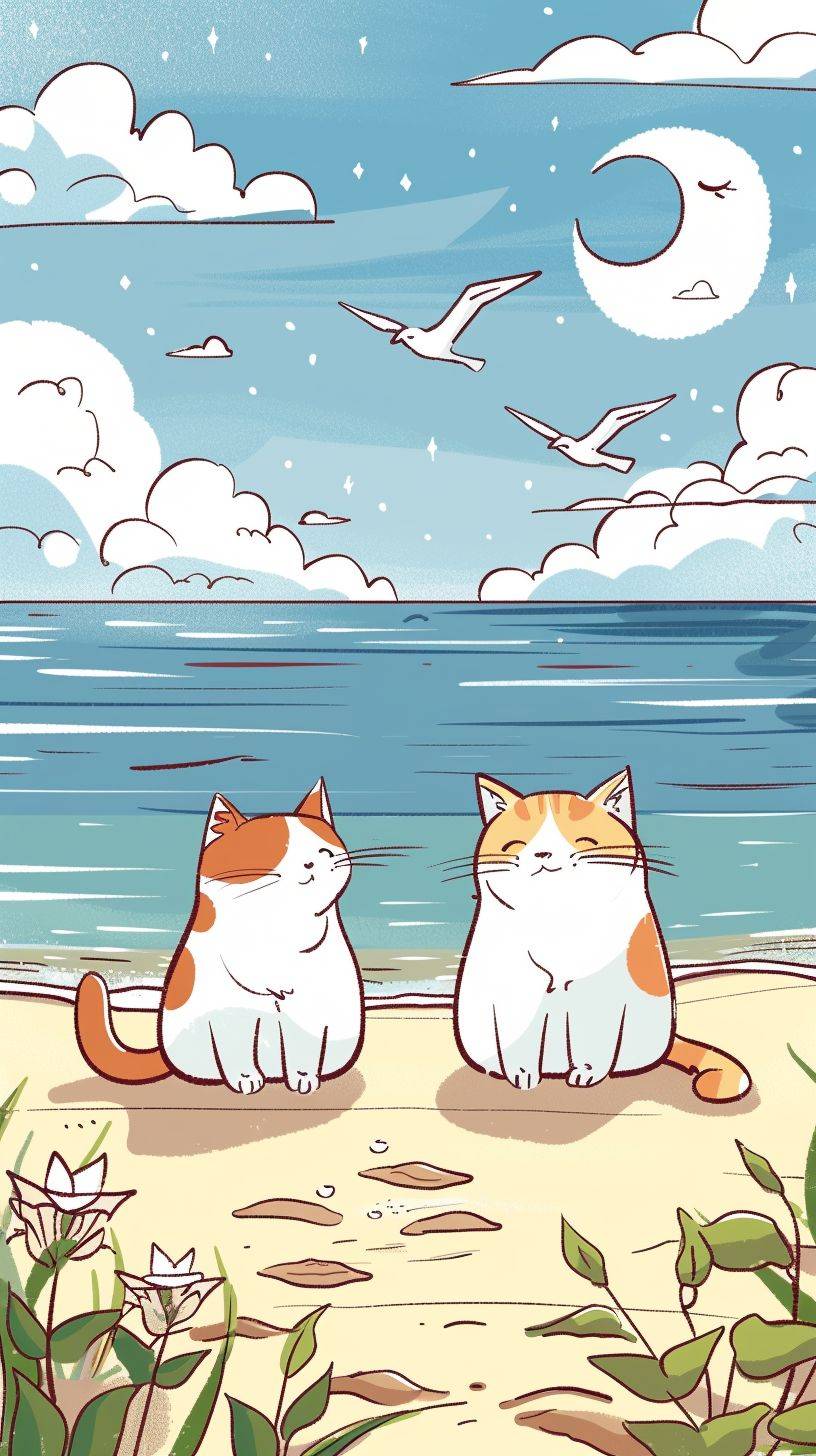 A cartoon beach scene depicts two cats sitting on the shore, overlooking calm waters and distant clouds under a clear blue sky, rendered in soft pastel colors. A minimalist style highlights the simple lines of the cute characters against the tranquil backdrop.