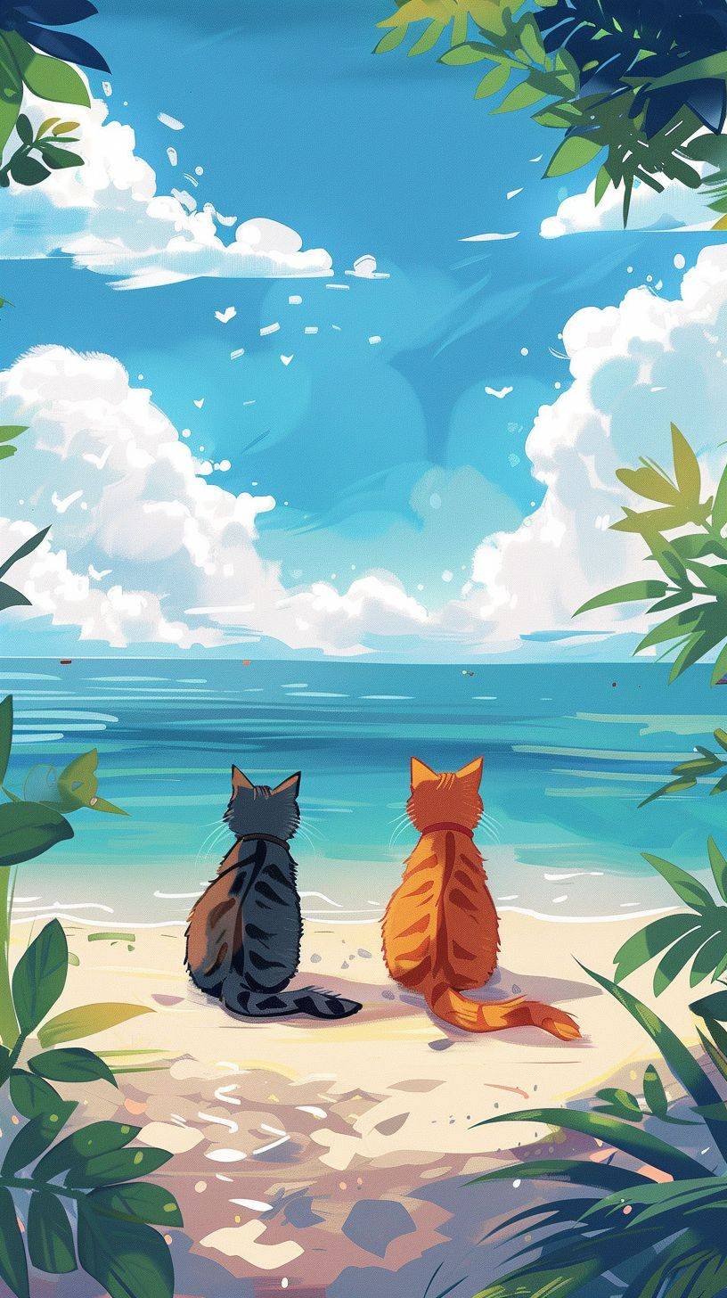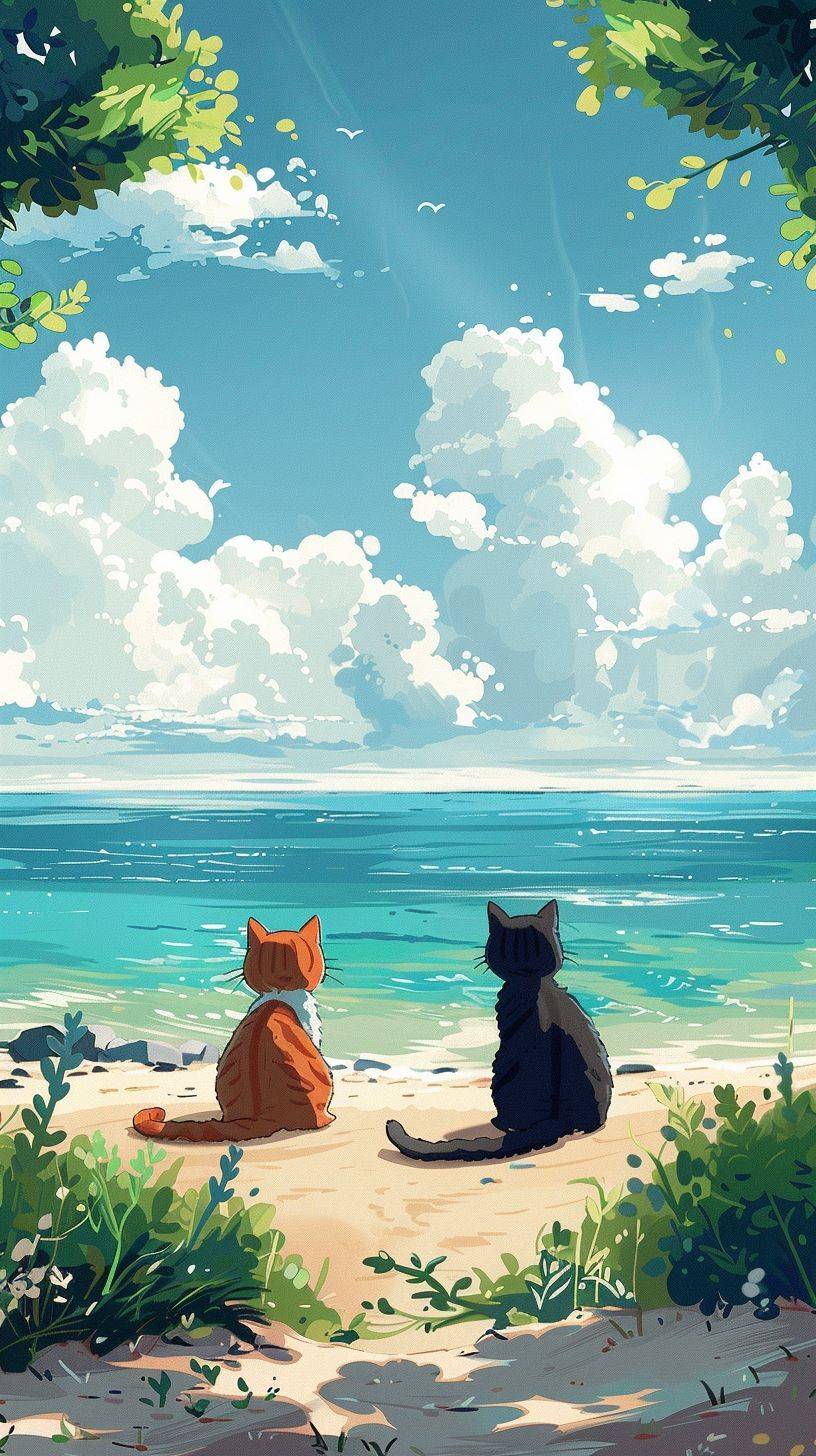 A cartoon beach scene depicts two cats sitting on the shore, overlooking calm waters and distant clouds under a clear blue sky. The background features sandy beaches and greenery rendered in soft pastel colors. A minimalist style highlights the simple lines of the cute characters against the tranquil backdrop of sea and sky in the style of a minimalist artist. --ar 9:16 --stylize 250
